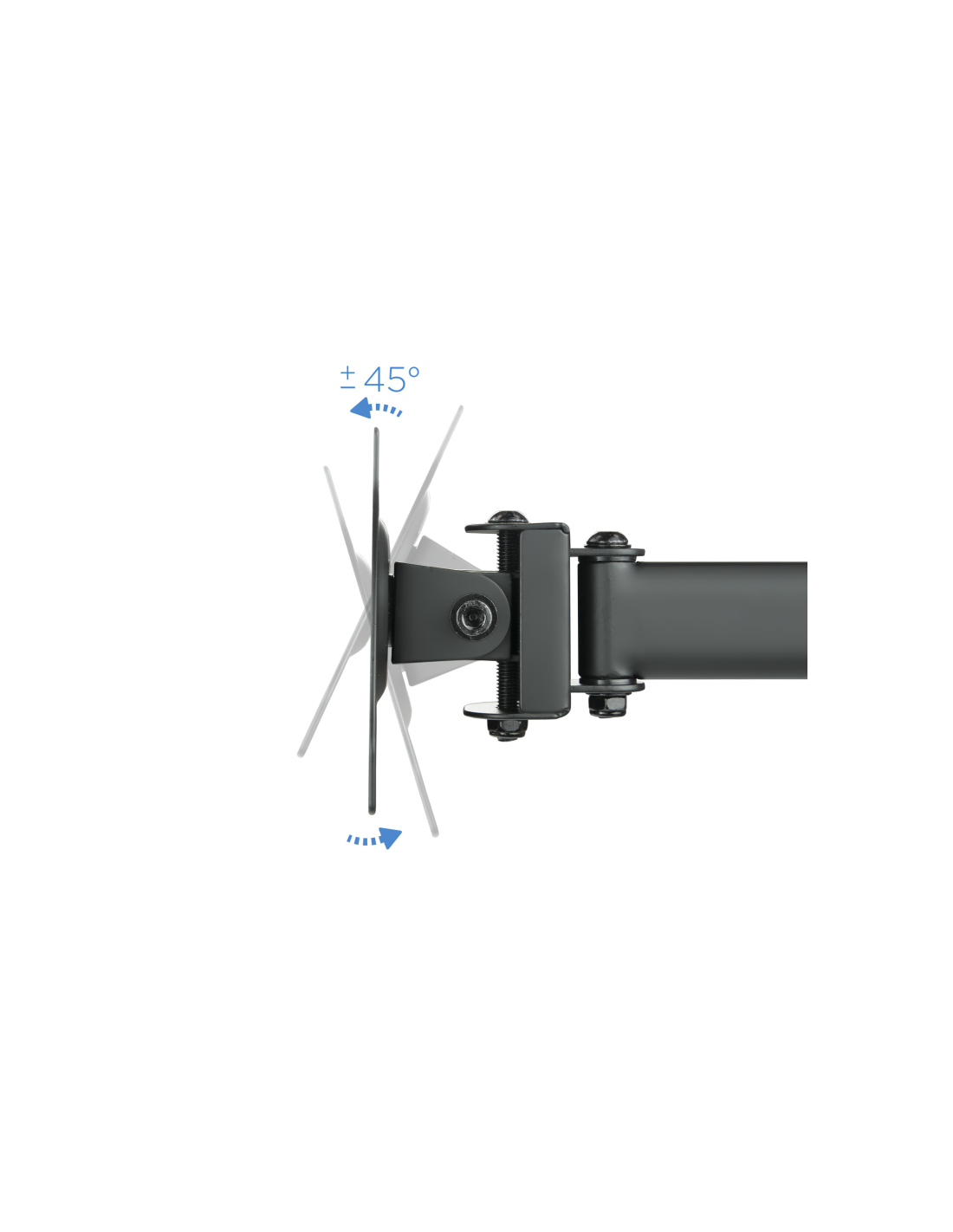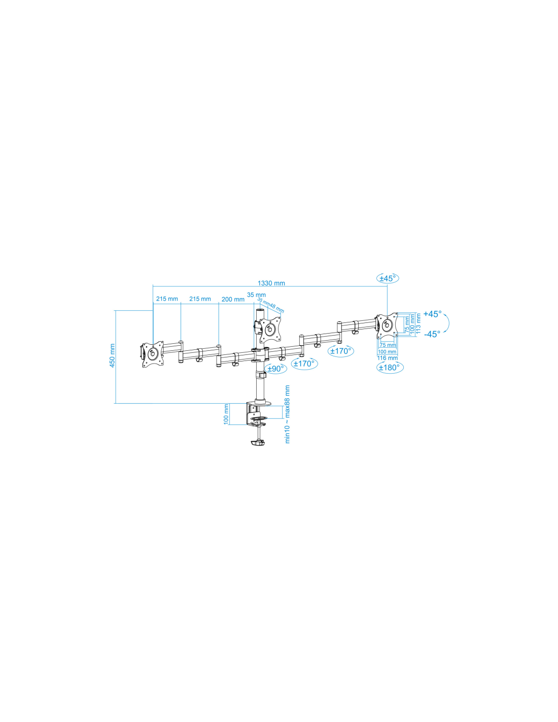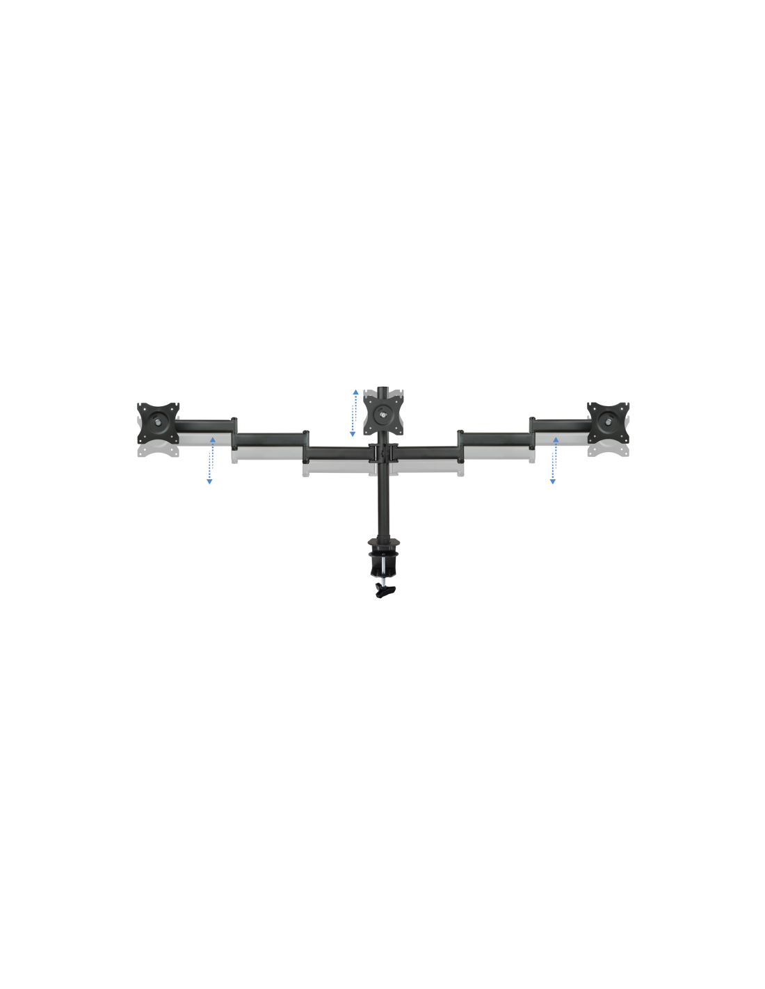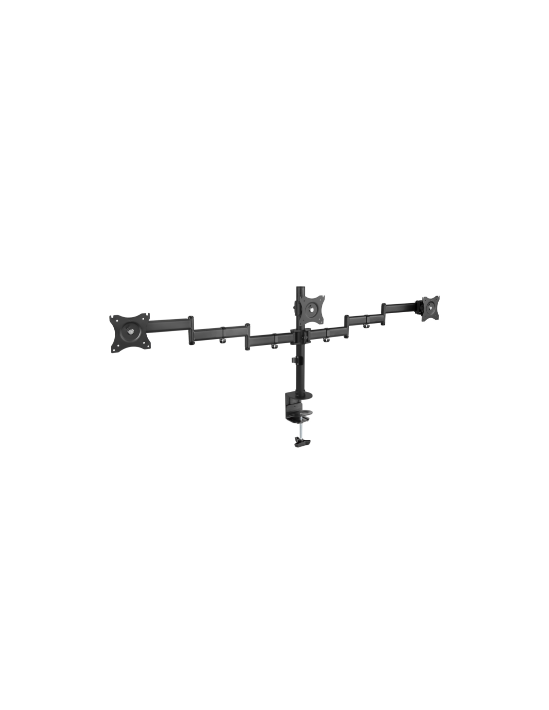 TooQ Soporte de mesa para 3 pantallas (monitor / plasma / LCD / LED) 13"-27". Montaje: Abrazadera, Capacidad máxima de peso: 8 kg, Tamaño mínimo de pantalla: 33 cm (13"), Tamaño máximo de pantalla: 68,6 cm (27"), Compatibilidad con interfaz de montaje (min): 75 x 75 mm, Compatibilidad con interfaz de montaje (max): 100 x 100 mm. Ajustes de altura, Ángulo de giro (alcance): -45 - 45°, Ángulo de inclinación: -45 - 45°. Color del producto: Negro
