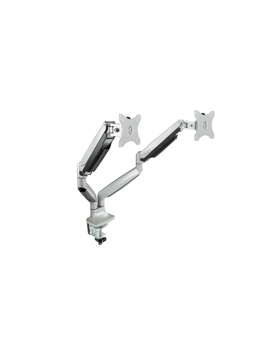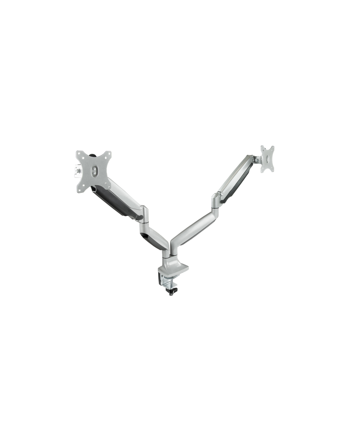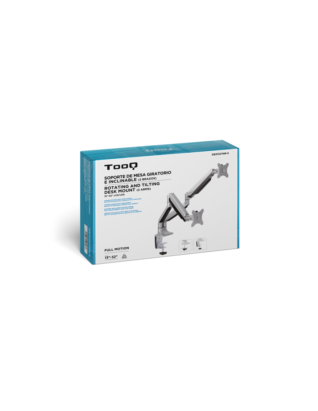 TooQ Soporte de Mesa Giratorio e Inclinable para 2 Pantallas (Monitor / TV Plasma / LCD / LED) 13” – 32”, de Dos Brazos, Plata. Montaje: Abrazadera/Atornillado, Capacidad máxima de peso: 18 kg, Tamaño mínimo de pantalla: 33 cm (13"), Tamaño máximo de pantalla: 81,3 cm (32"), Compatibilidad con interfaz de montaje (min): 75 x 75 mm, Compatibilidad con interfaz de montaje (max): 100 x 100 mm. Ángulo de inclinación: -90 - 90°. Color del producto: Plata