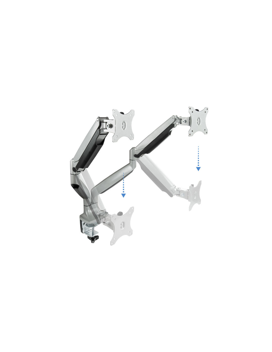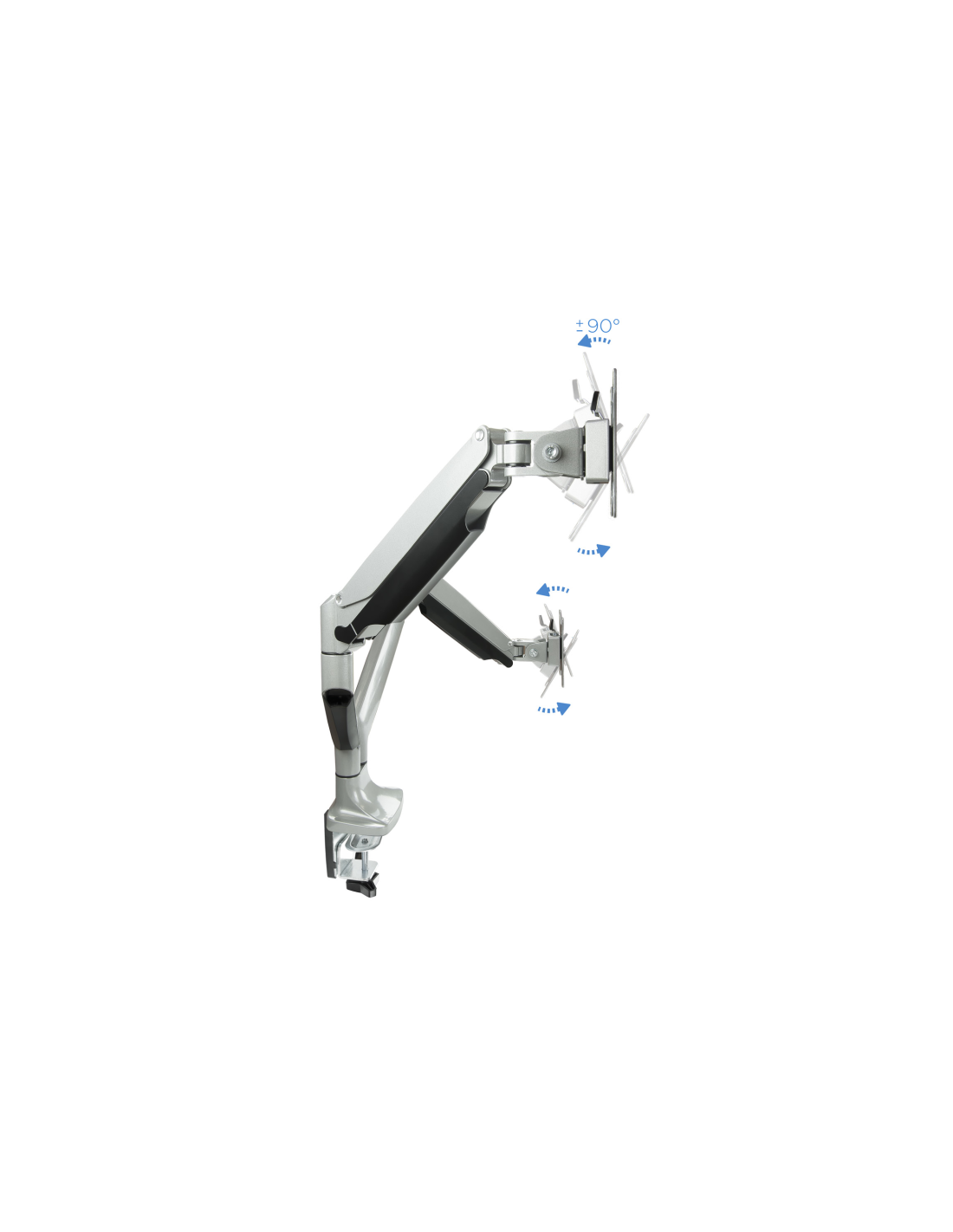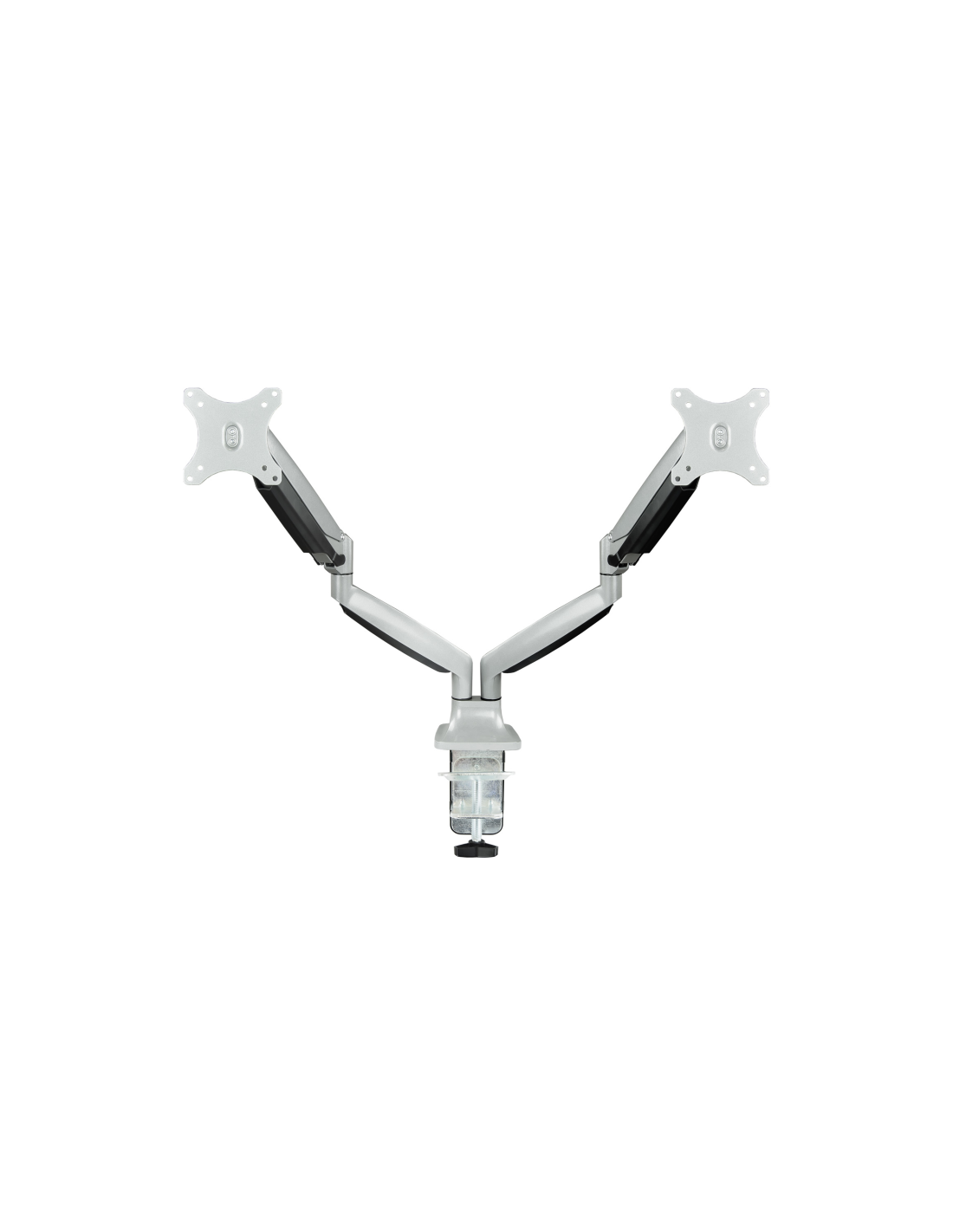 TooQ Soporte de Mesa Giratorio e Inclinable para 2 Pantallas (Monitor / TV Plasma / LCD / LED) 13” – 32”, de Dos Brazos, Plata. Montaje: Abrazadera/Atornillado, Capacidad máxima de peso: 18 kg, Tamaño mínimo de pantalla: 33 cm (13"), Tamaño máximo de pantalla: 81,3 cm (32"), Compatibilidad con interfaz de montaje (min): 75 x 75 mm, Compatibilidad con interfaz de montaje (max): 100 x 100 mm. Ángulo de inclinación: -90 - 90°. Color del producto: Plata