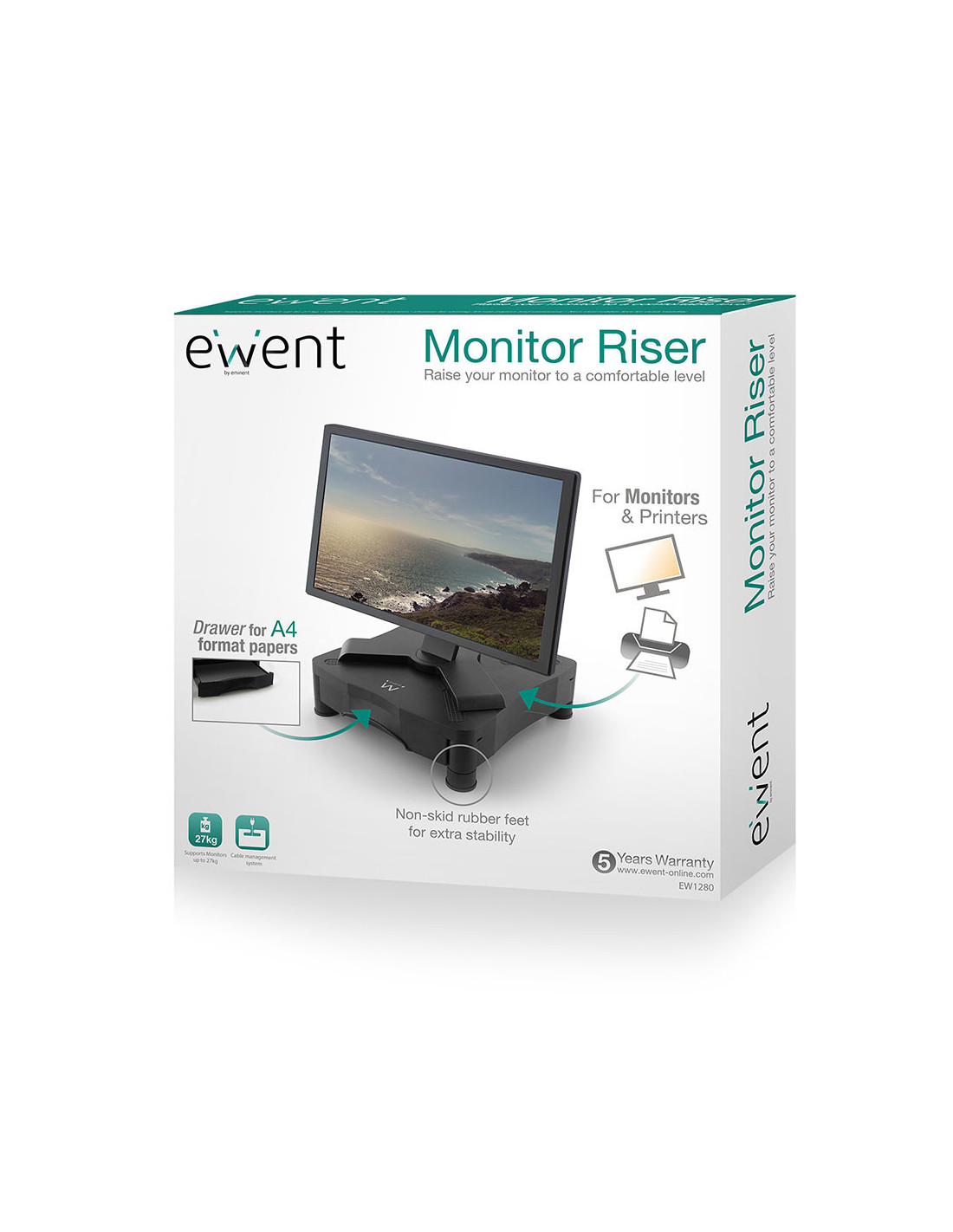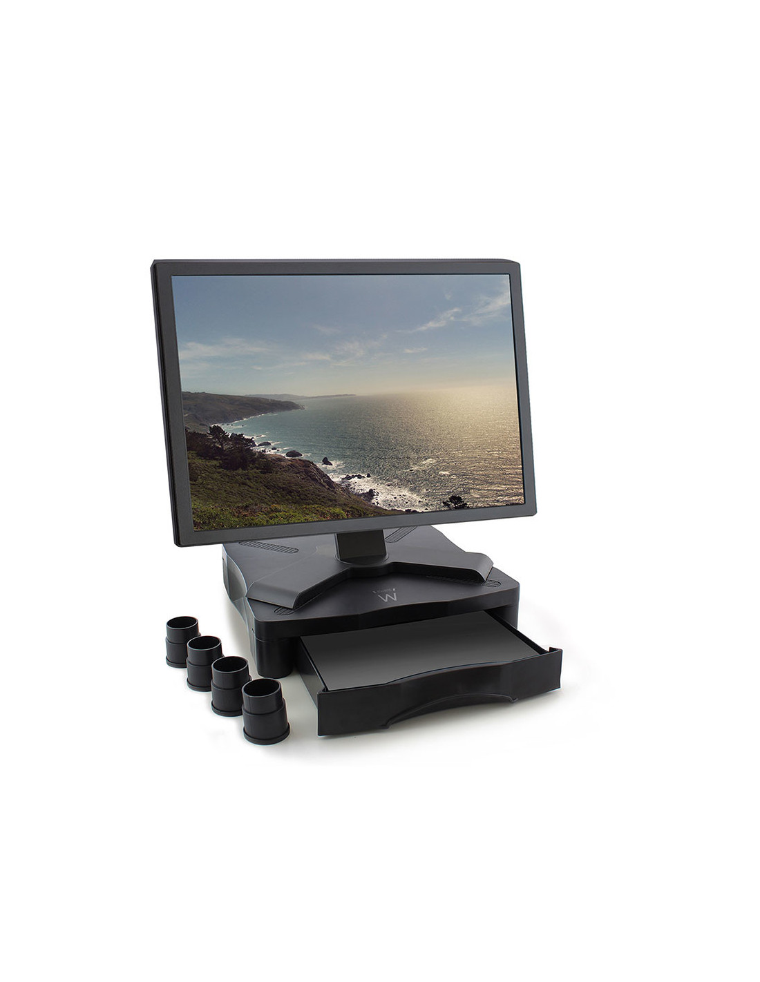 El Elevador de Monitor EW1280 eleva su monitor a una altura cómoda para usted. Organice sus cables con el sistema de cableado. En su útil cajón podrá almacenar sus folios A4 y su material de escritorio. Sus patas de goma antideslizantes garantizan la estabilidad del Elevador de Monitor.