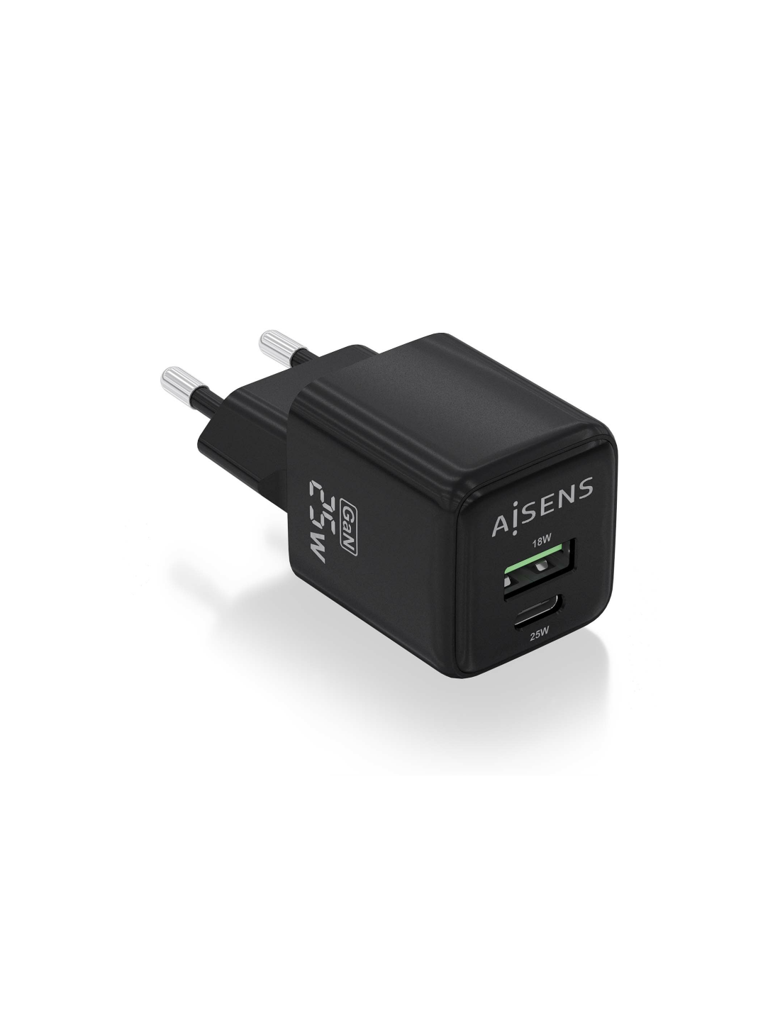 AISENS Cargador GaN 25W, 1xUSB-C PD3.0 QC4.0, 1xUSB-A QC3.0, Negro. Tipo de cargador: Interior, Alimentación: Corriente alterna, Compatibilidad del cargador: Universal. Voltaje de entrada: 100 - 240 V, Voltaje de salida máximo: 12 V. Cantidad de puertos USB 2.0: 1, Número de puertos USB Tipo C: 1, Carga rápida, Funciones de protección de poder: Sobrecarga, Sobrecarga, Cortocircuito. Color del producto: Negro