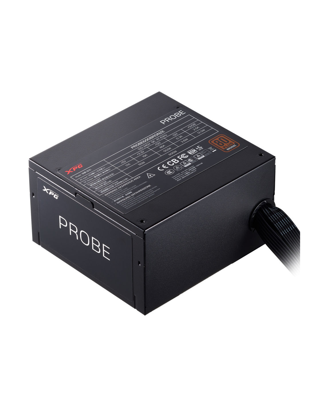 XPG FUENTE DE ALIMENTACIÓN PROBE 700 BRONCE. Potencia total: 700 W, Voltaje de entrada AC: 100 - 240 V, Frecuencia de entrada AC: 47 - 63 Hz. Alimentador de energía para tarjeta madre: 20+4 pin ATX, Tipo de cableado: No modular. Utilizar con: PC, Factor de forma de fuente de alimentación (PSU): ATX, Certificación 80 PLUS: 80 PLUS Bronze. Color del producto: Negro, Tipo de enfriamiento: Activo, Diámetro de ventilador: 12 cm. Certificación: CB, CE, FCC, TUV, cTUVus, BSMI, CCC, NOM, FCC IC, UKCA,EAC, RCM