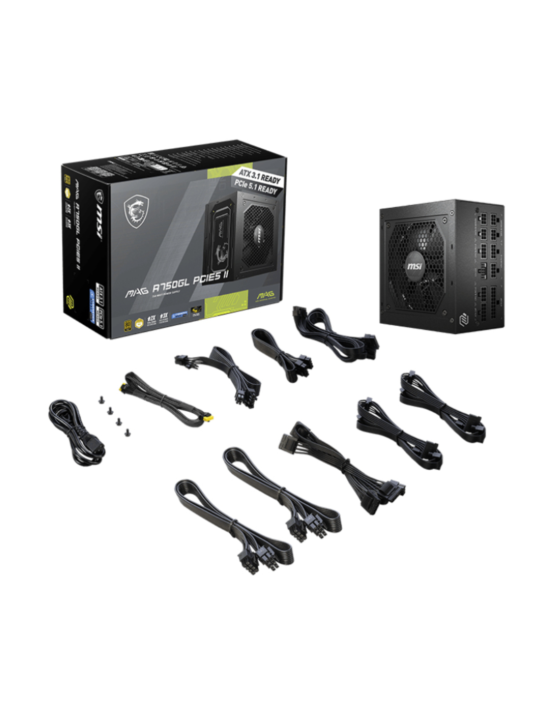 MSI MAG A750GL PCIE5 II. Potencia total: 750 W, Voltaje de entrada AC: 100 - 240 V, Frecuencia de entrada AC: 47 - 63 Hz. Alimentador de energía para tarjeta madre: 20+4 pin ATX, Longitud del cable de alimentación de la placa base: 60 cm, Longitud del cable de alimentación SATA: 150,500 mm. Utilizar con: PC, Factor de forma de fuente de alimentación (PSU): ATX, Certificación 80 PLUS: 80 PLUS Gold. Color del producto: Negro, Tipo de enfriamiento: Activo, Diámetro de ventilador: 12 cm. Ancho: 150 mm, Profundi