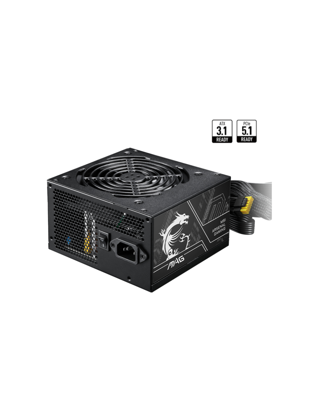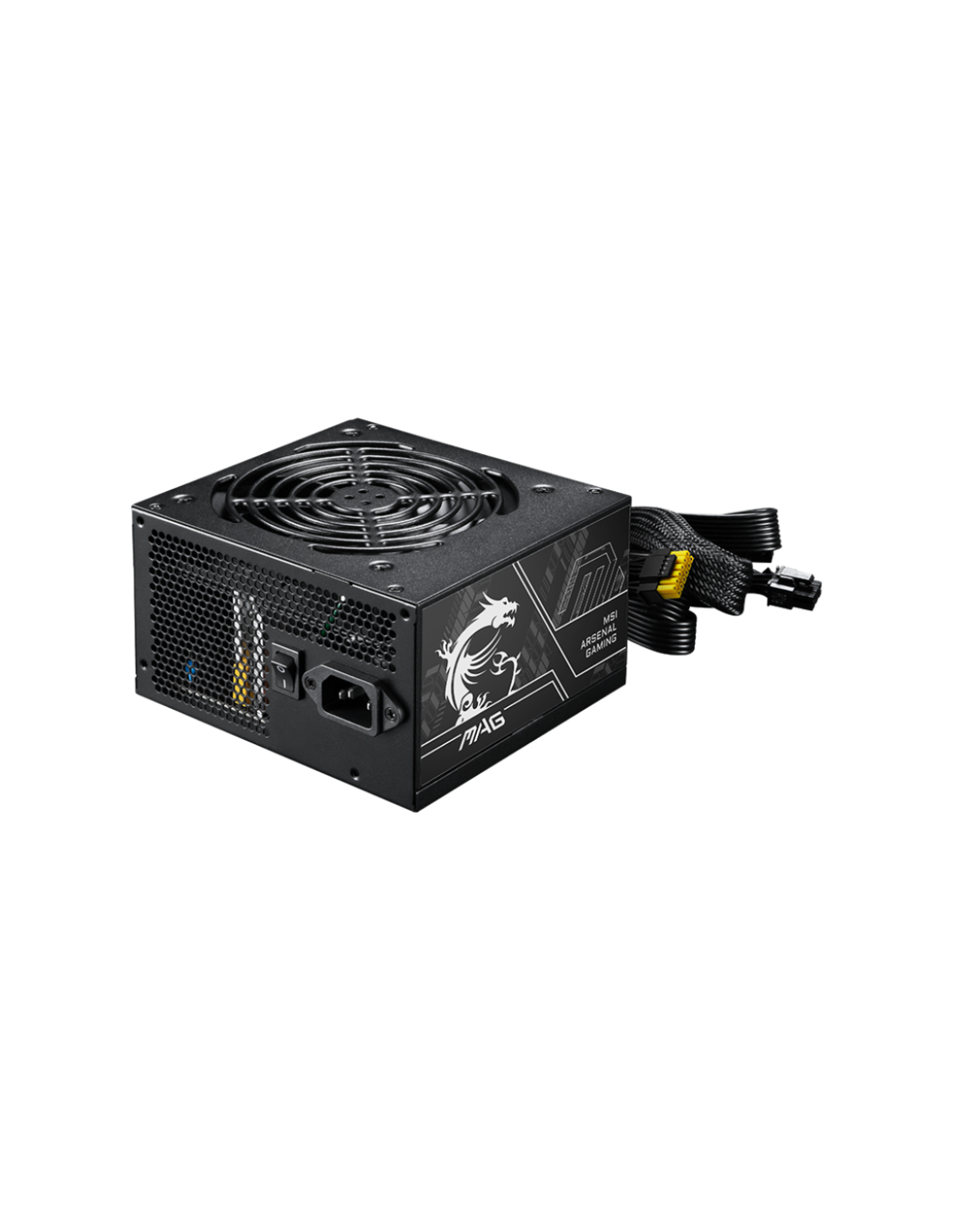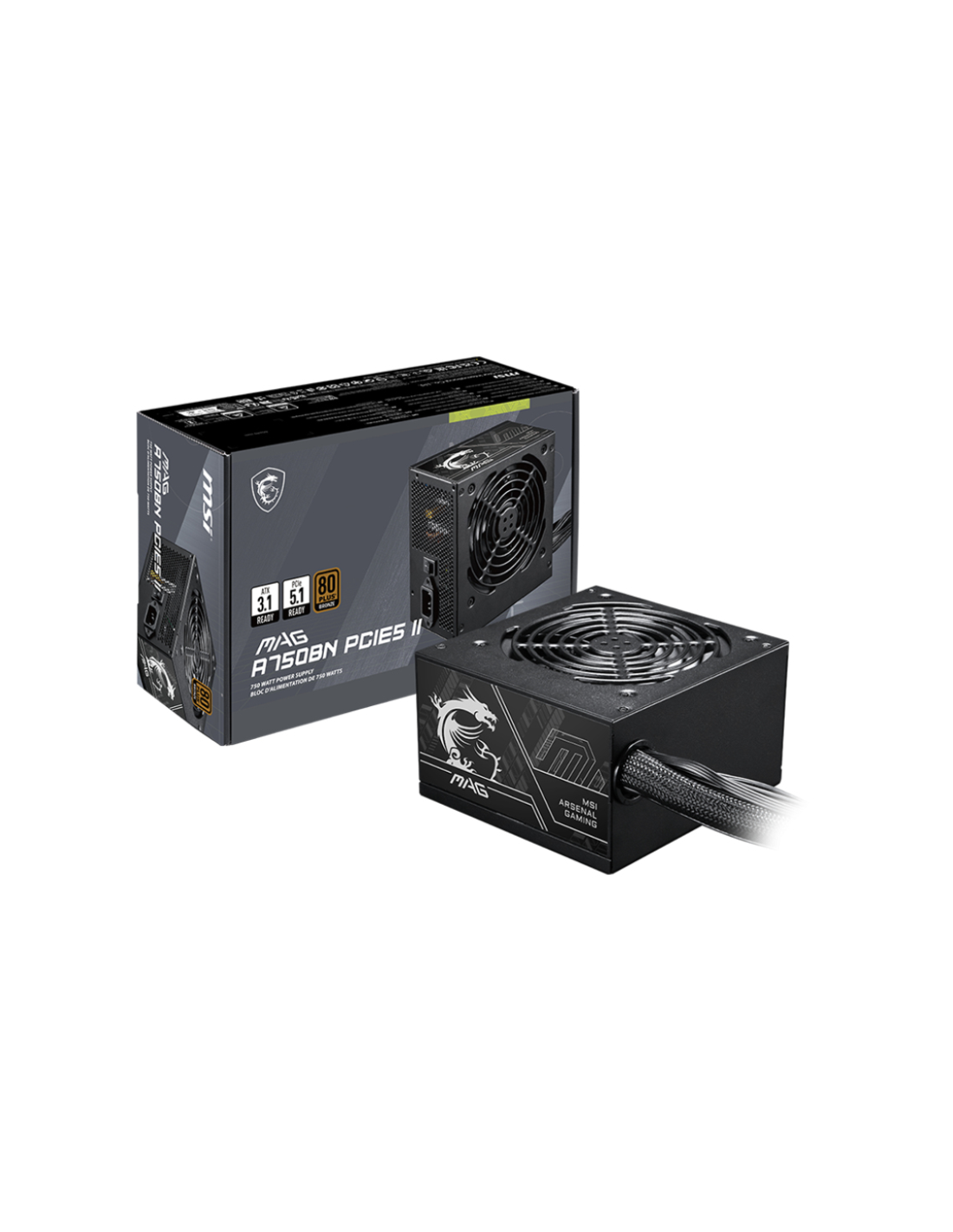 MSI MAG A750BN PCIE5 II. Potencia total: 750 W, Voltaje de entrada AC: 100 - 240 V, Frecuencia de entrada AC: 50/60 Hz. Alimentador de energía para tarjeta madre: 24-pin ATX, Tipo de cableado: No modular. Utilizar con: PC, Factor de forma de fuente de alimentación (PSU): ATX, Certificación 80 PLUS: 80 PLUS Bronze. Color del producto: Negro, Tipo de enfriamiento: Activo, Diámetro de ventilador: 12 cm. Ancho: 150 mm, Profundidad: 140 mm, Altura: 86 mm