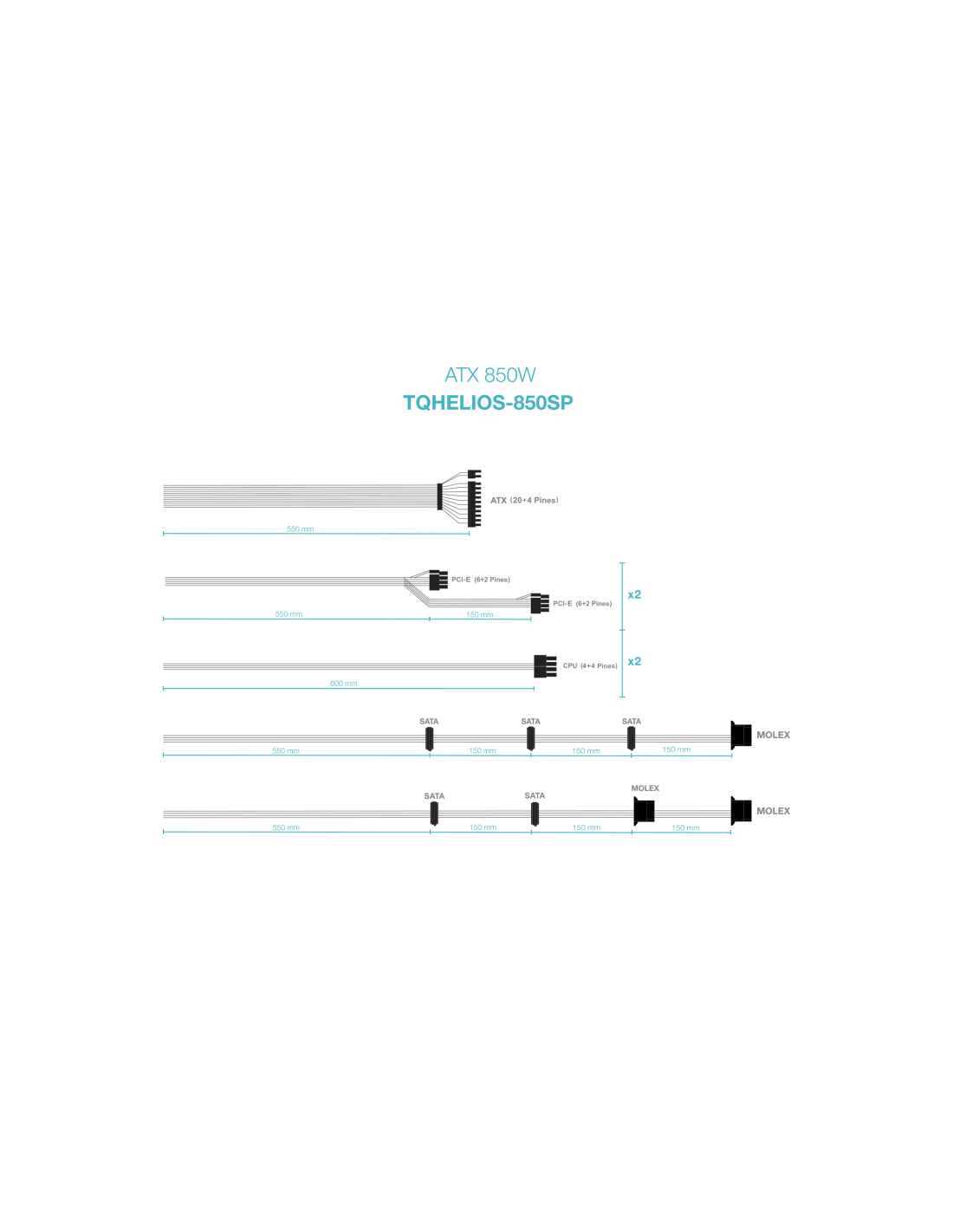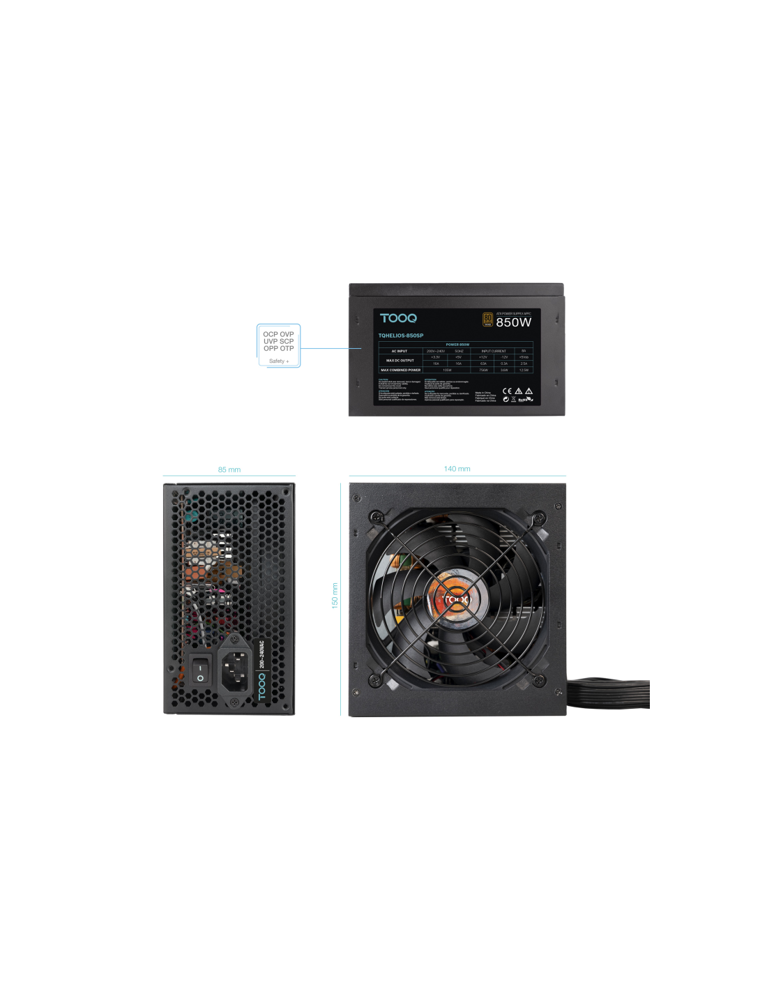 TooQ Fuente de alimentación ATX 850W APFC 80Plus Bronze. Potencia total: 850 W, Voltaje de entrada AC: 200 - 240 V, Frecuencia de entrada AC: 50 Hz. Alimentador de energía para tarjeta madre: 24-pin ATX, Longitud del cable de alimentación de la placa base: 55 cm, Longitud del cable de alimentación SATA: 550,700,850,1000 mm. Utilizar con: PC, Factor de forma de fuente de alimentación (PSU): ATX, Certificación 80 PLUS: 80 PLUS Bronze. Color del producto: Negro, Tipo de enfriamiento: Activo, Diámetro de ventil