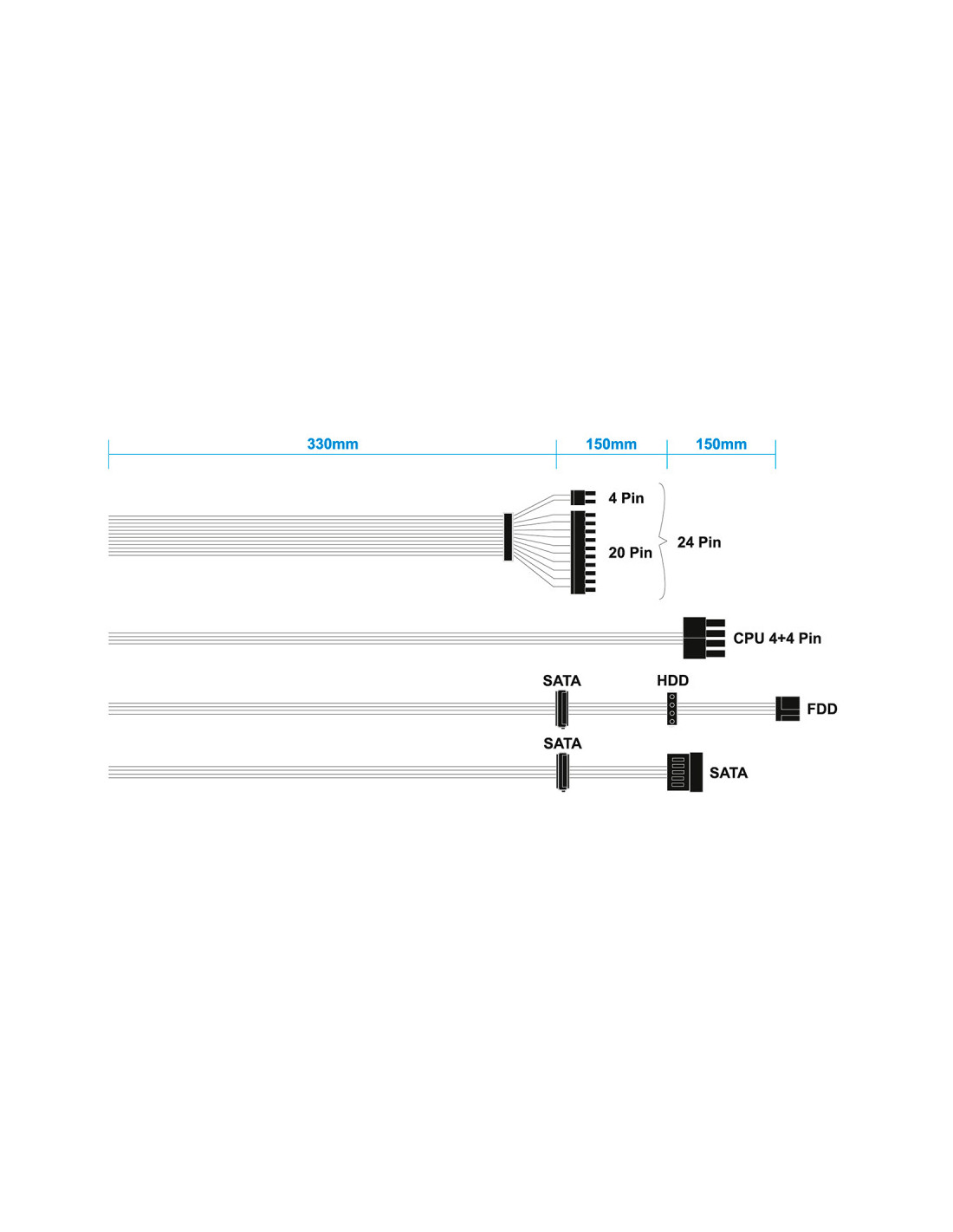 > 1 conector SATA + 1 conector Molex +1 conector mini-Molex (tipo Floppy, 4 pines) 330+150+150mm