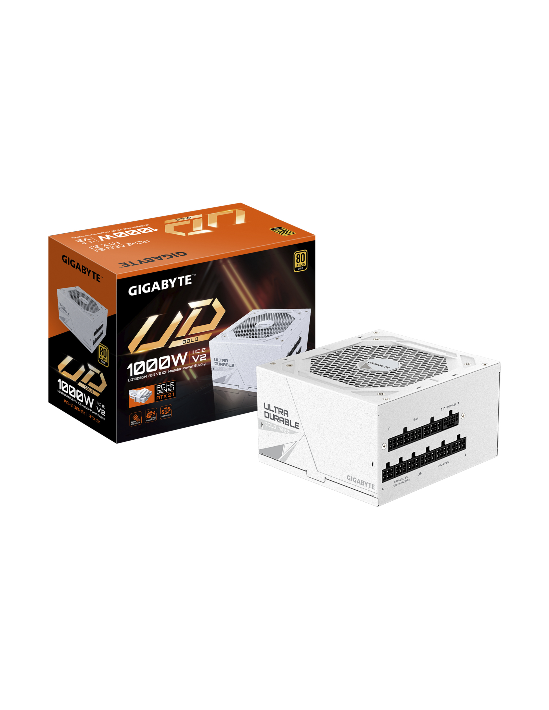 GIGABYTE UD1000GM PG5 V2 ICE Fuente de Alimentación – PCIe Gen 5.1, 80 PLUS Gold, Diseño completamente modular, Ventilador de 120 mm, Compatible con ATX 3.1, Enchufe EU. Potencia total: 1000 W, Voltaje de entrada AC: 100 - 240 V, Frecuencia de entrada AC: 50/60 Hz. Alimentador de energía para tarjeta madre: 20+4 pin ATX, Longitud del cable de alimentación de la placa base: 61 cm, Longitud del cable de conectores de alimentación PCI Express (12+4 pines): 700 mm. Utilizar con: PC, Factor de forma de fuente de