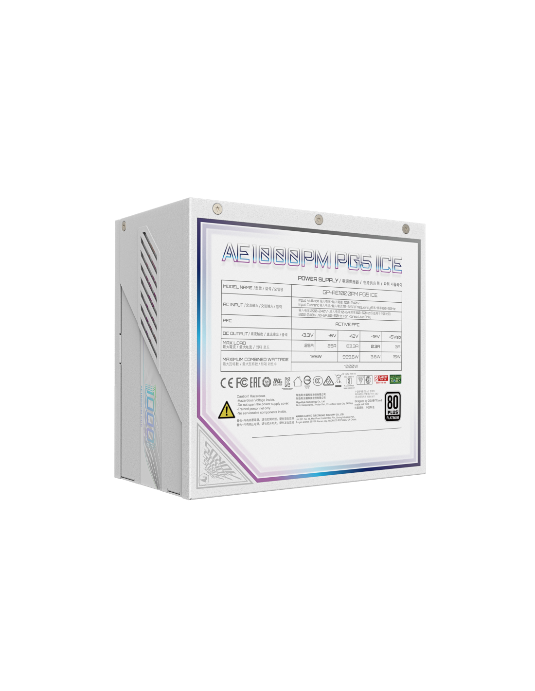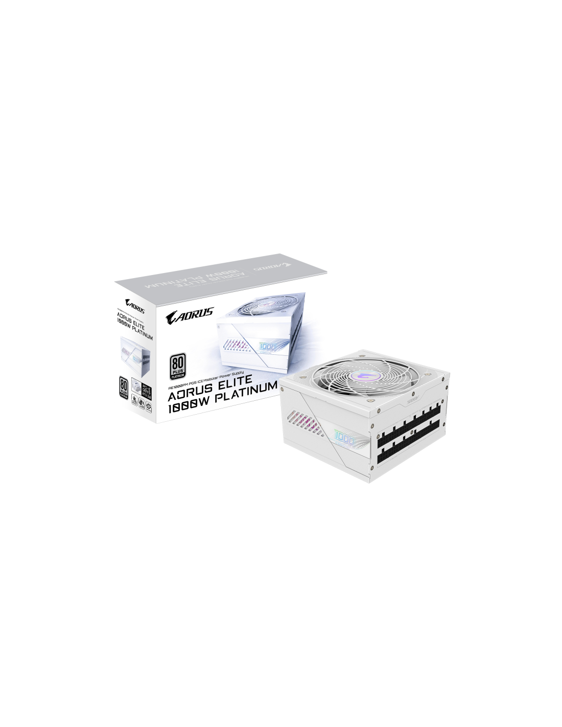 GIGABYTE AORUS ELITE P1000W ICE Fuente de Alimentación - PCIe 5.0, 80 PLUS Platinum, Diseño completamente modular, Ventilador de 120 mm, Compatible con ATX 3.0, Enchufe UE. Potencia total: 1000 W, Voltaje de entrada AC: 100 - 240 V, Frecuencia de entrada AC: 50/60 Hz. Alimentador de energía para tarjeta madre: 20+4 pin ATX, Longitud del cable de alimentación de la placa base: 65 cm, Tipo de cableado: Totalmente modular. Utilizar con: PC, Factor de forma de fuente de alimentación (PSU): ATX, Certificación 80
