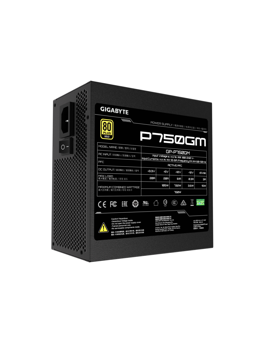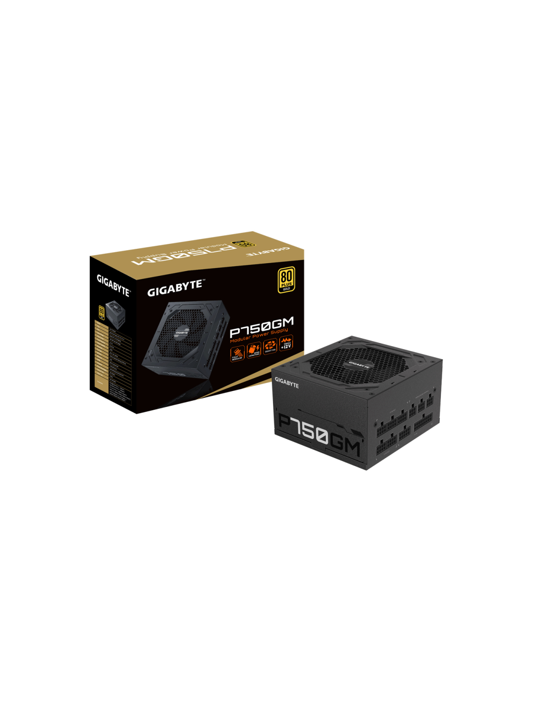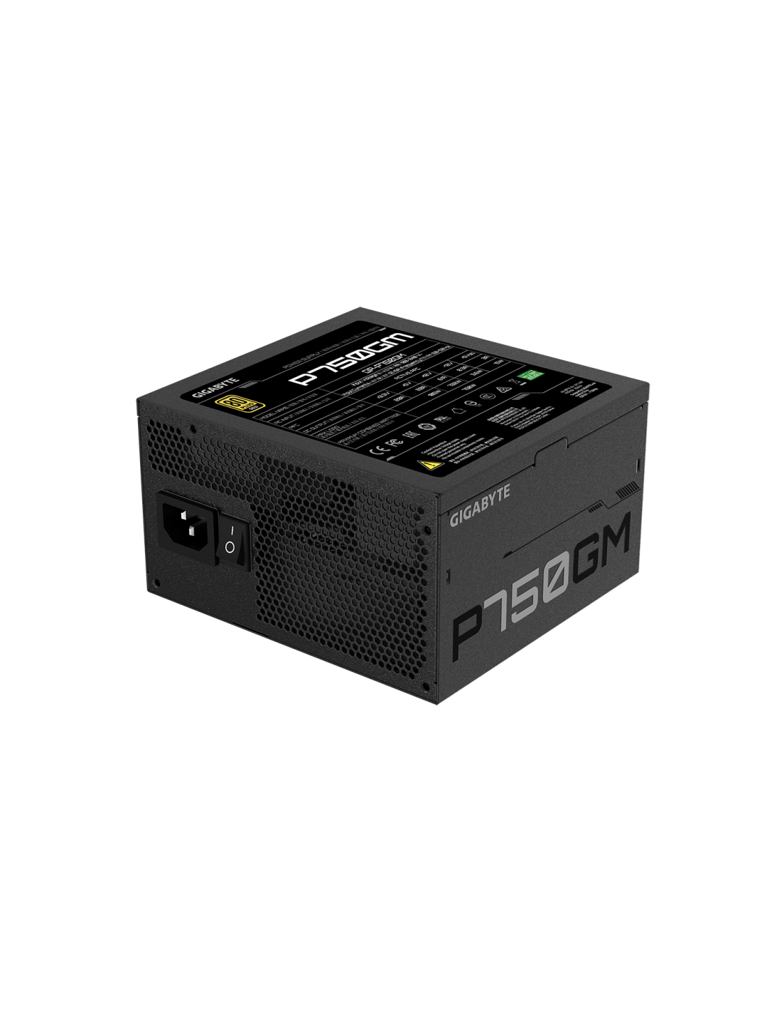 GIGABYTE P750GM. Potencia total: 750 W, Voltaje de entrada AC: 100 - 240 V, Frecuencia de entrada AC: 50 - 60 Hz. Alimentador de energía para tarjeta madre: 20+4 pin ATX, Longitud del cable de alimentación de la placa base: 61 cm, Longitud del cable de alimentación SATA: 150,600 mm. Utilizar con: PC, Factor de forma de fuente de alimentación (PSU): ATX, Certificación 80 PLUS: 80 PLUS Gold. Color del producto: Negro, Tipo de enfriamiento: Activo, Diámetro de ventilador: 12 cm. Ancho: 150 mm, Profundidad: 140