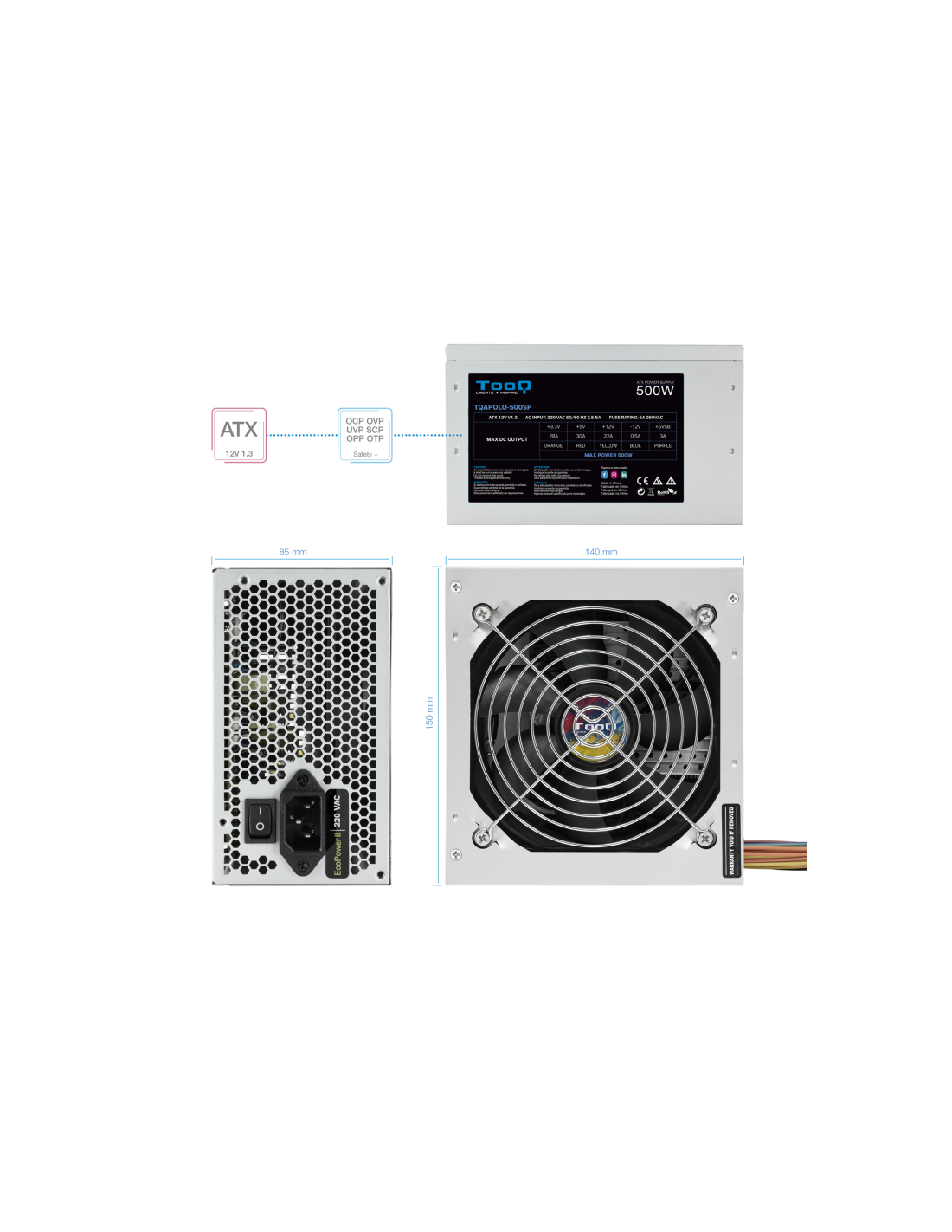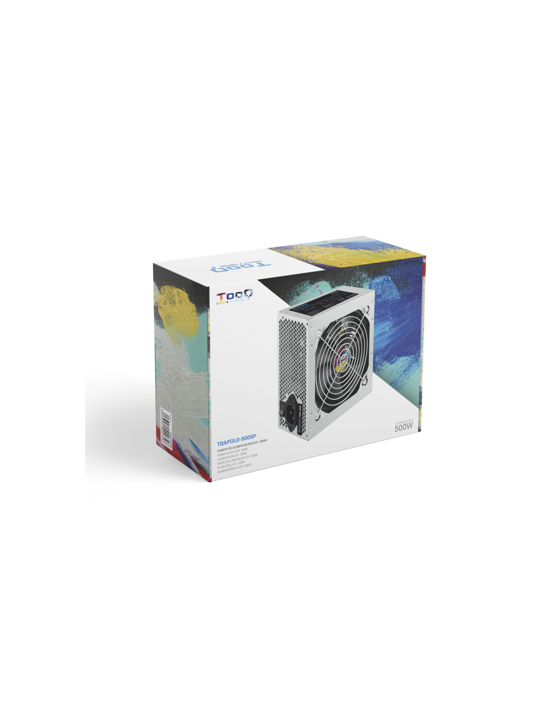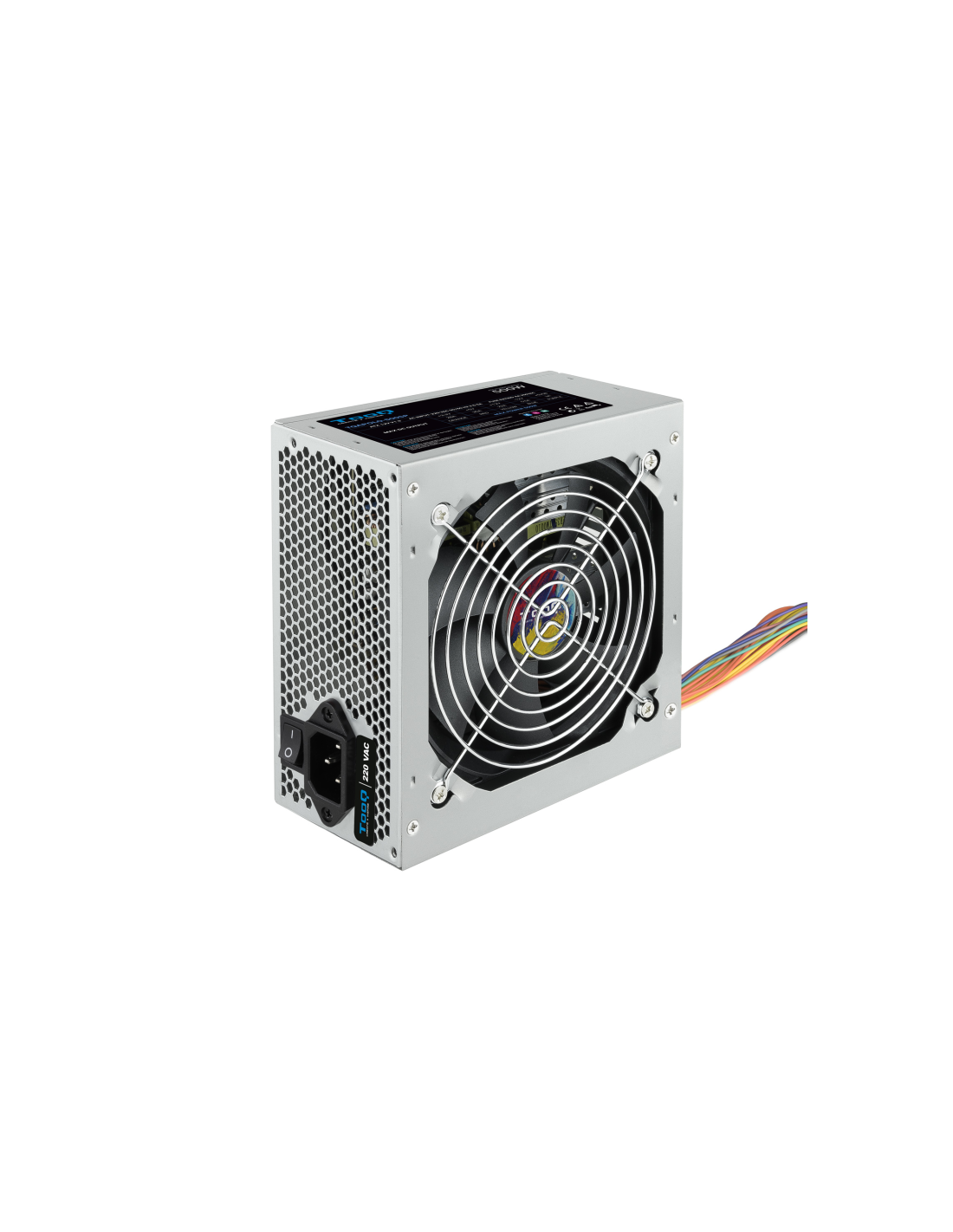 TooQ TQAPOLO-500SP. Potencia total: 500 W, Voltaje de entrada AC: 220 V, Frecuencia de entrada AC: 50 - 60 Hz. Alimentador de energía para tarjeta madre: 20+4 pin ATX, Longitud del cable de alimentación de la placa base: 40 cm, Longitud del cable de alimentación SATA: 400,550 mm. Utilizar con: PC, Factor de forma de fuente de alimentación (PSU): ATX. Color del producto: Plata, Tipo de enfriamiento: Activo, Diámetro de ventilador: 12 cm. Cables incluidos: Corriente alterna