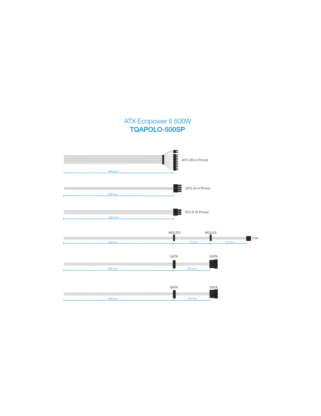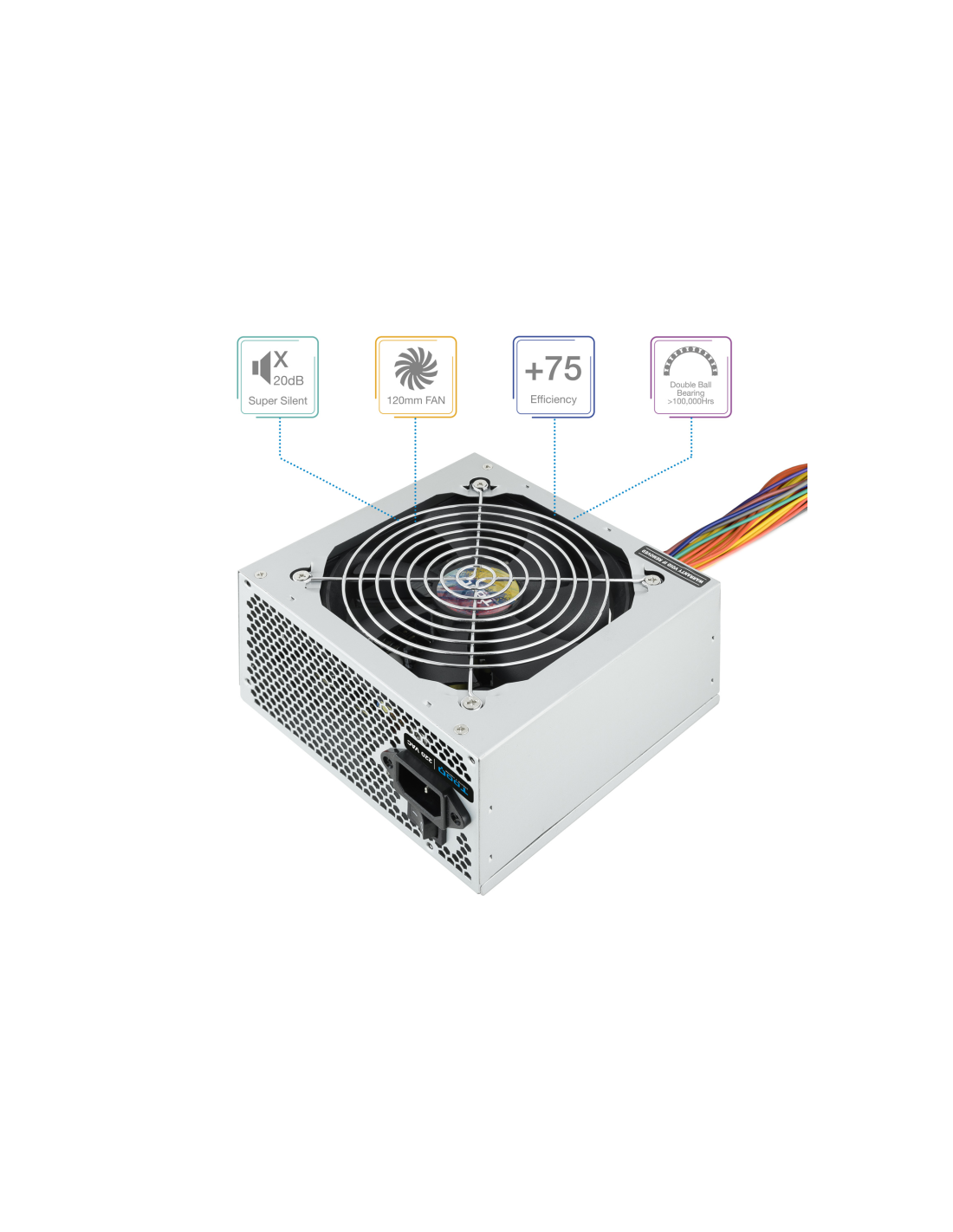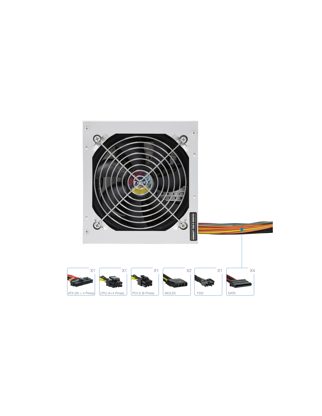 TooQ TQAPOLO-500SP. Potencia total: 500 W, Voltaje de entrada AC: 220 V, Frecuencia de entrada AC: 50 - 60 Hz. Alimentador de energía para tarjeta madre: 20+4 pin ATX, Longitud del cable de alimentación de la placa base: 40 cm, Longitud del cable de alimentación SATA: 400,550 mm. Utilizar con: PC, Factor de forma de fuente de alimentación (PSU): ATX. Color del producto: Plata, Tipo de enfriamiento: Activo, Diámetro de ventilador: 12 cm. Cables incluidos: Corriente alterna