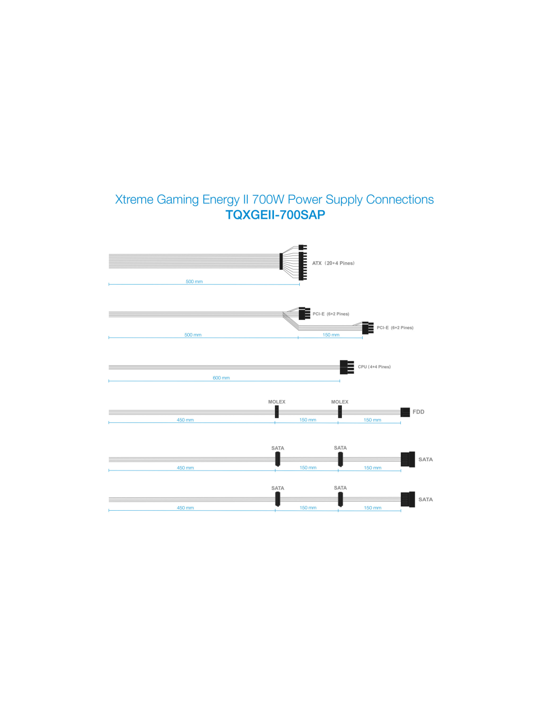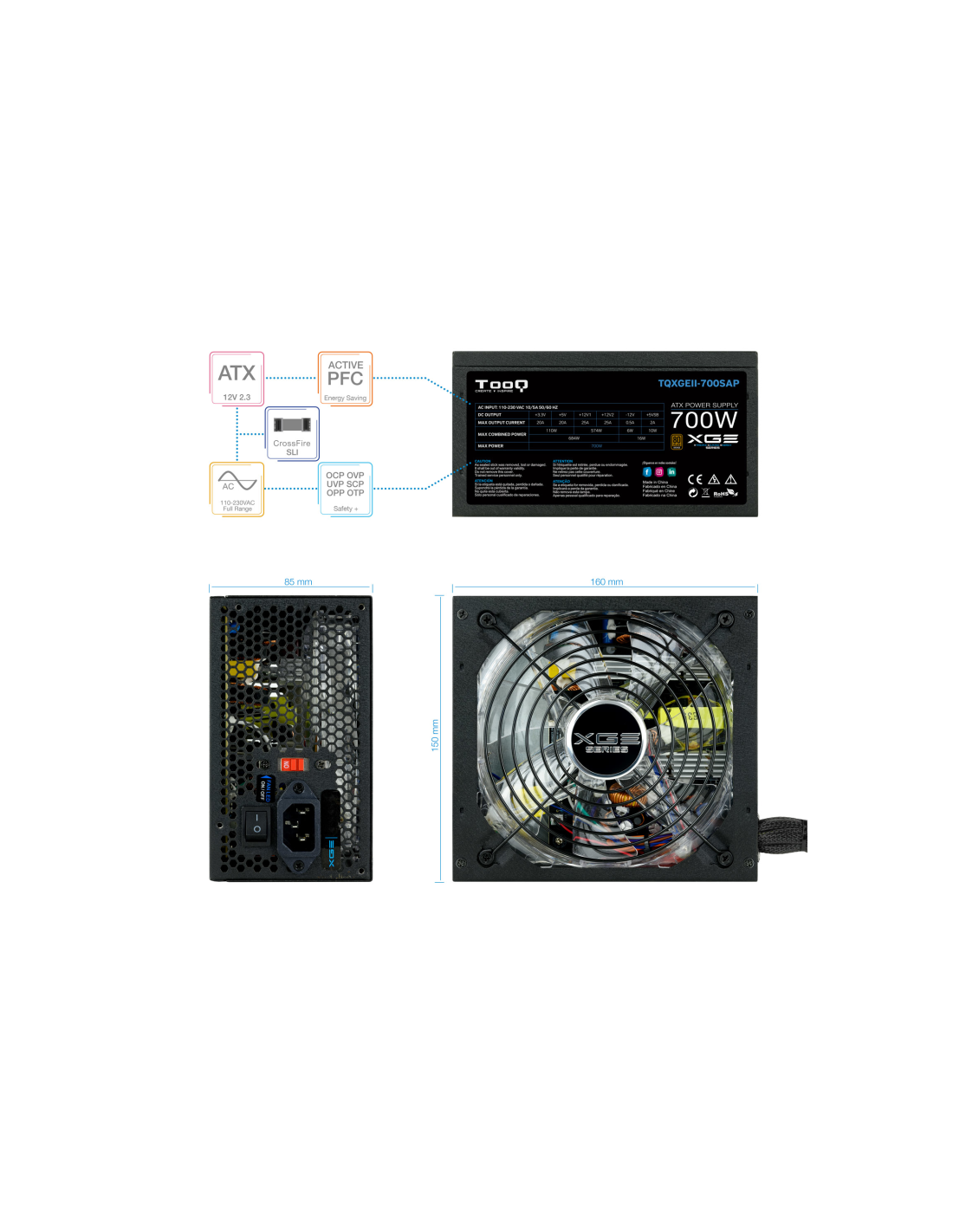 TooQ TQXGEII-700SAP. Potencia total: 700 W, Voltaje de entrada AC: 110 - 230 V, Frecuencia de entrada AC: 50 - 60 Hz. Alimentador de energía para tarjeta madre: 20+4 pin ATX, Longitud del cable de alimentación de la placa base: 50 cm, Longitud del cable de alimentación SATA: 450,600,750 mm. Utilizar con: PC, Factor de forma de fuente de alimentación (PSU): ATX, Certificación 80 PLUS: 80 PLUS Bronze. Color del producto: Negro, Tipo de enfriamiento: Activo, Diámetro de ventilador: 14 cm. Cables incluidos: Cor