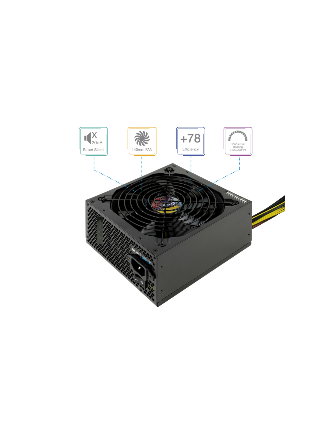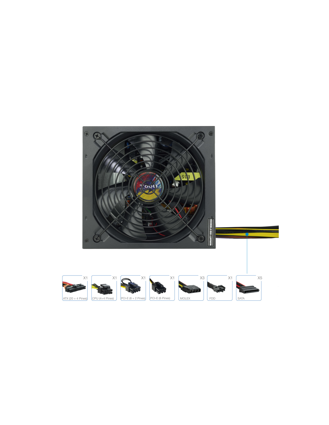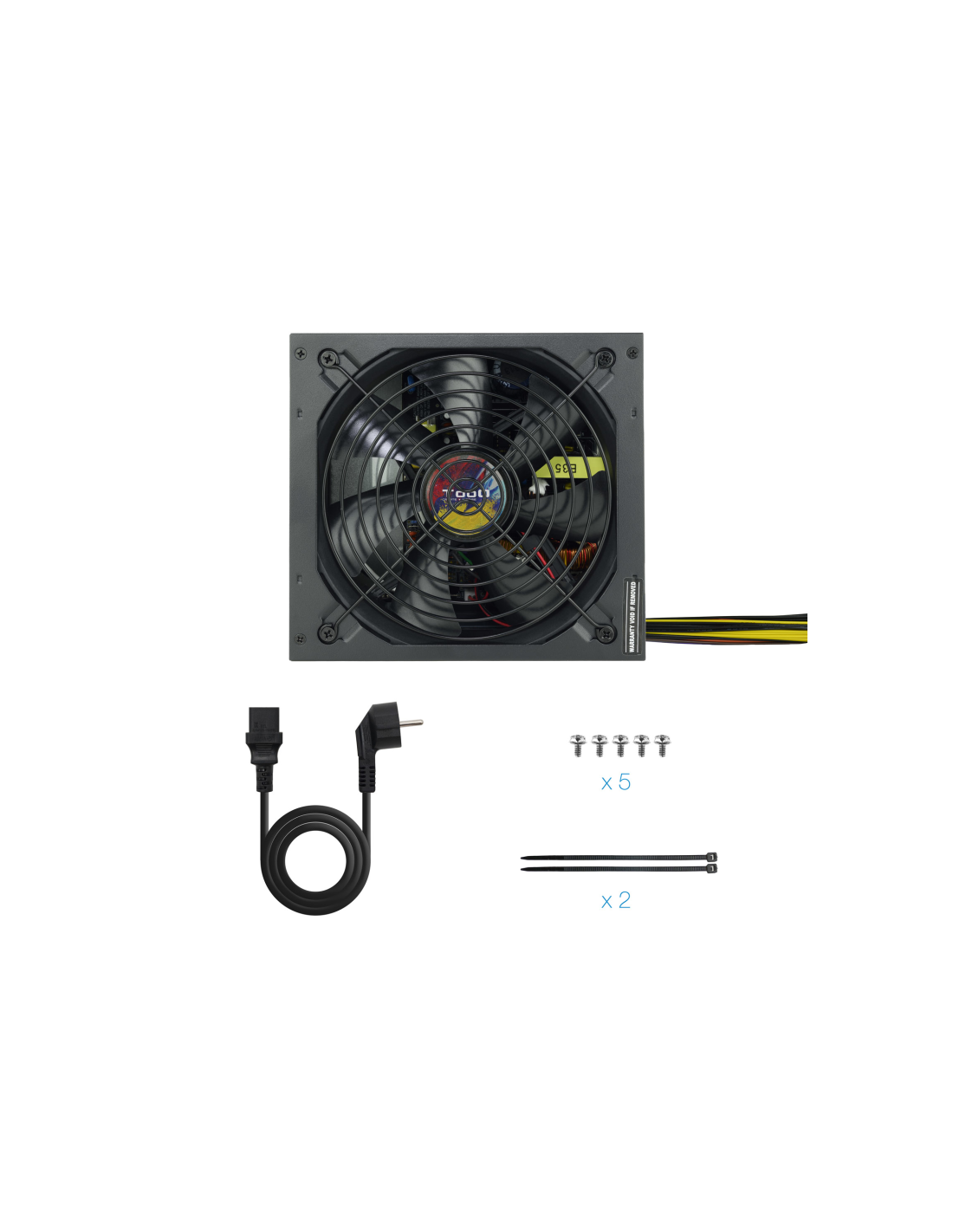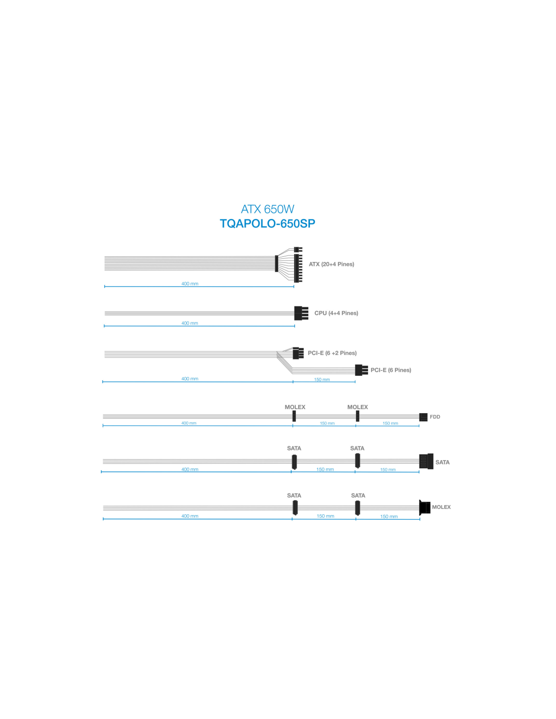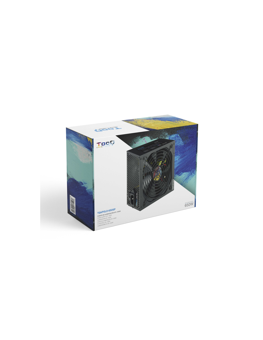 TooQ TQAPOLO-650SP. Potencia total: 650 W, Voltaje de entrada AC: 220 V, Frecuencia de entrada AC: 50 - 60 Hz. Alimentador de energía para tarjeta madre: 20+4 pin ATX, Longitud del cable de alimentación de la placa base: 40 cm, Longitud del cable de alimentación SATA: 400,550,700 mm. Utilizar con: PC, Factor de forma de fuente de alimentación (PSU): ATX, Formas de factor de tarjeta madre soportadas: ATX. Color del producto: Negro, Tipo de enfriamiento: Activo, Diámetro de ventilador: 14 cm. Cables incluidos