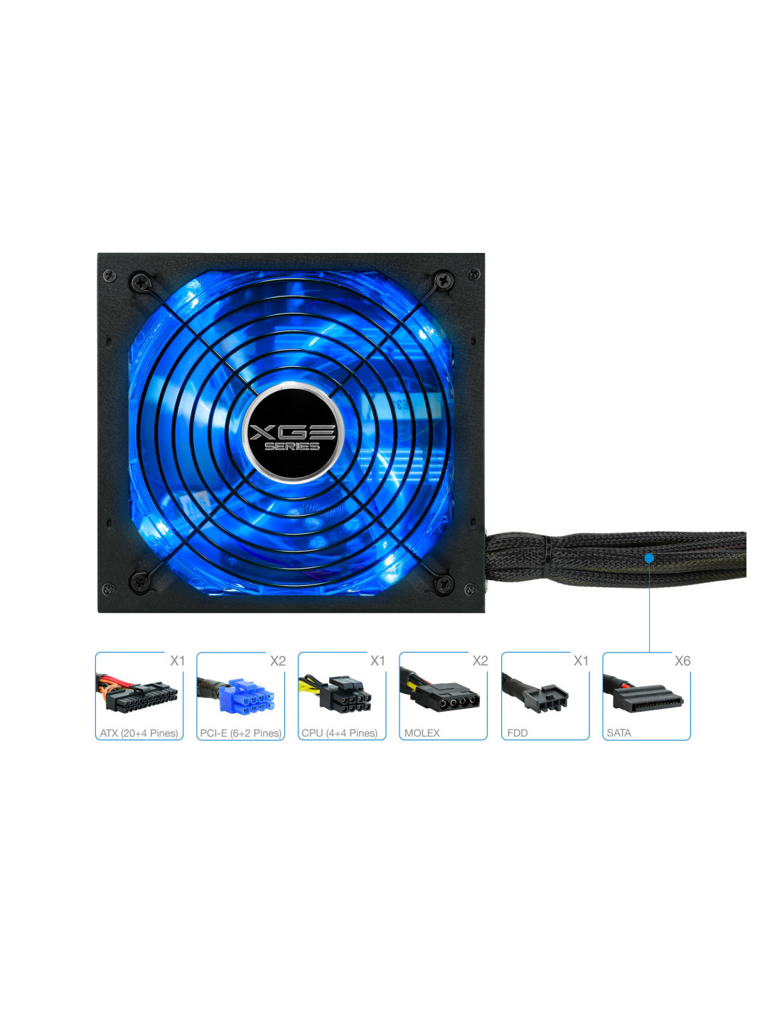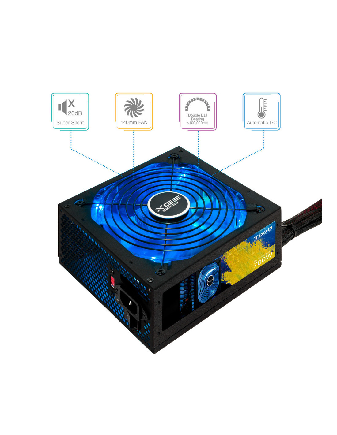 La serie gaming XGE II de TOOQ está diseñada para jugadores muy entusiastas y configuraciones exigentes. Esta serie de fuentes de alimentación de alto rendimiento lleva el certificado 80 PLUS BRONZE, por lo que se garantiza más del 82% de eficiencia. La poderosa salida +12V garantiza la alimentación de microprocesadores y GPU multi núcleos de última generación. Esta fuente incorpora un ventilador con luz LED azul APAGABLE para adaptar a las necesidades de cada usuario. El ventilador lleva rodamientos fabricados con doble cojinete de bolas, con lo cual tiene una vida útil exageradamente larga (más de 20 años de vida útil con uso de 10 horas diarias). Sabemos que los jugadores exigentes usan torres altas, por lo tanto, esta fuente incorpora cables extra largos y mallados para que los jugadores monten su equipo tranquilamente sin sorpresa. En conclusión, es el “corazón” potente y perfecto para empujar su súper configuración de equipo.