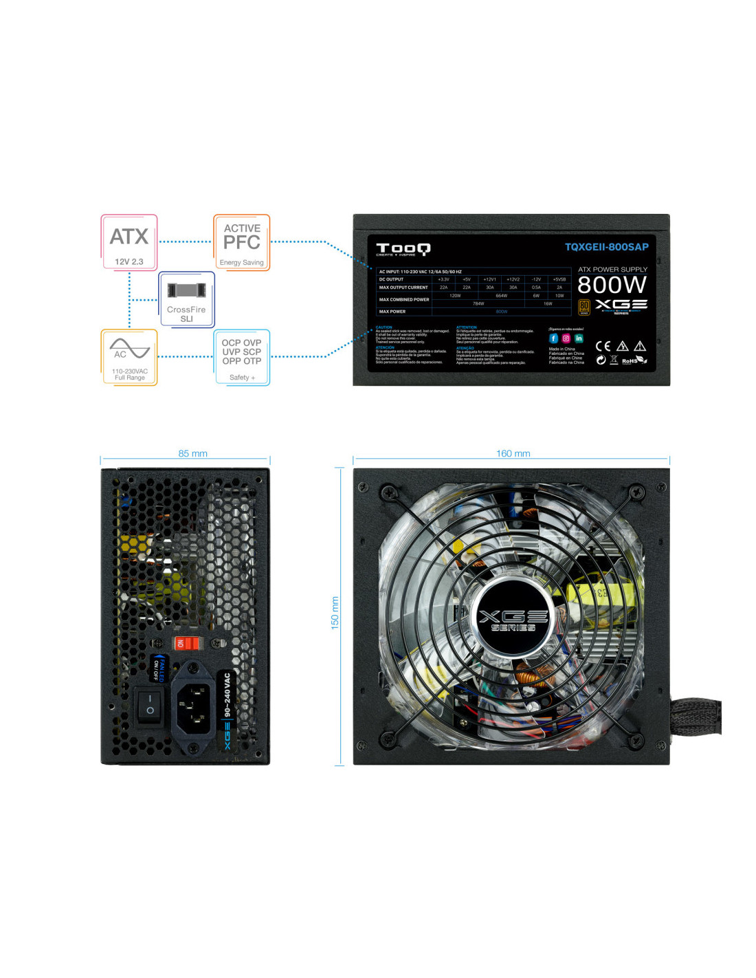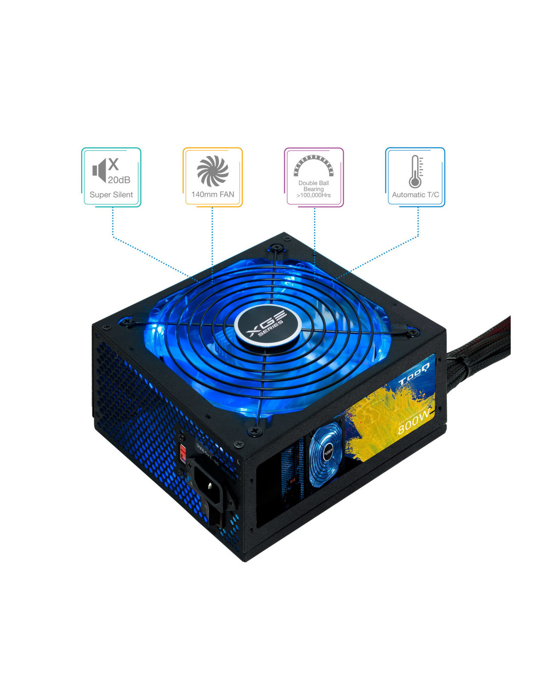 La serie gaming XGE II de TOOQ está diseñada para jugadores muy entusiastas y configuraciones exigentes. Esta serie de fuentes de alimentación de alto rendimiento lleva el certificado 80 PLUS BRONZE, por lo que se garantiza más del 82% de eficiencia. La poderosa salida +12V garantiza la alimentación de microprocesadores y GPU multi núcleos de última generación. Esta fuente incorpora un ventilador con luz LED azul APAGABLE para adaptar a las necesidades de cada usuario. El ventilador lleva rodamientos fabricados con doble cojinete de bolas, con lo cual tiene una vida útil exageradamente larga (más de 20 años de vida útil con uso de 10 horas diarias). Sabemos que los jugadores exigentes usan torres altas, por lo tanto, esta fuente incorpora cables extra largos y mallados para que los jugadores monten su equipo tranquilamente sin sorpresa. En conclusión, es el “corazón” potente y perfecto para empujar su súper configuración de equipo.