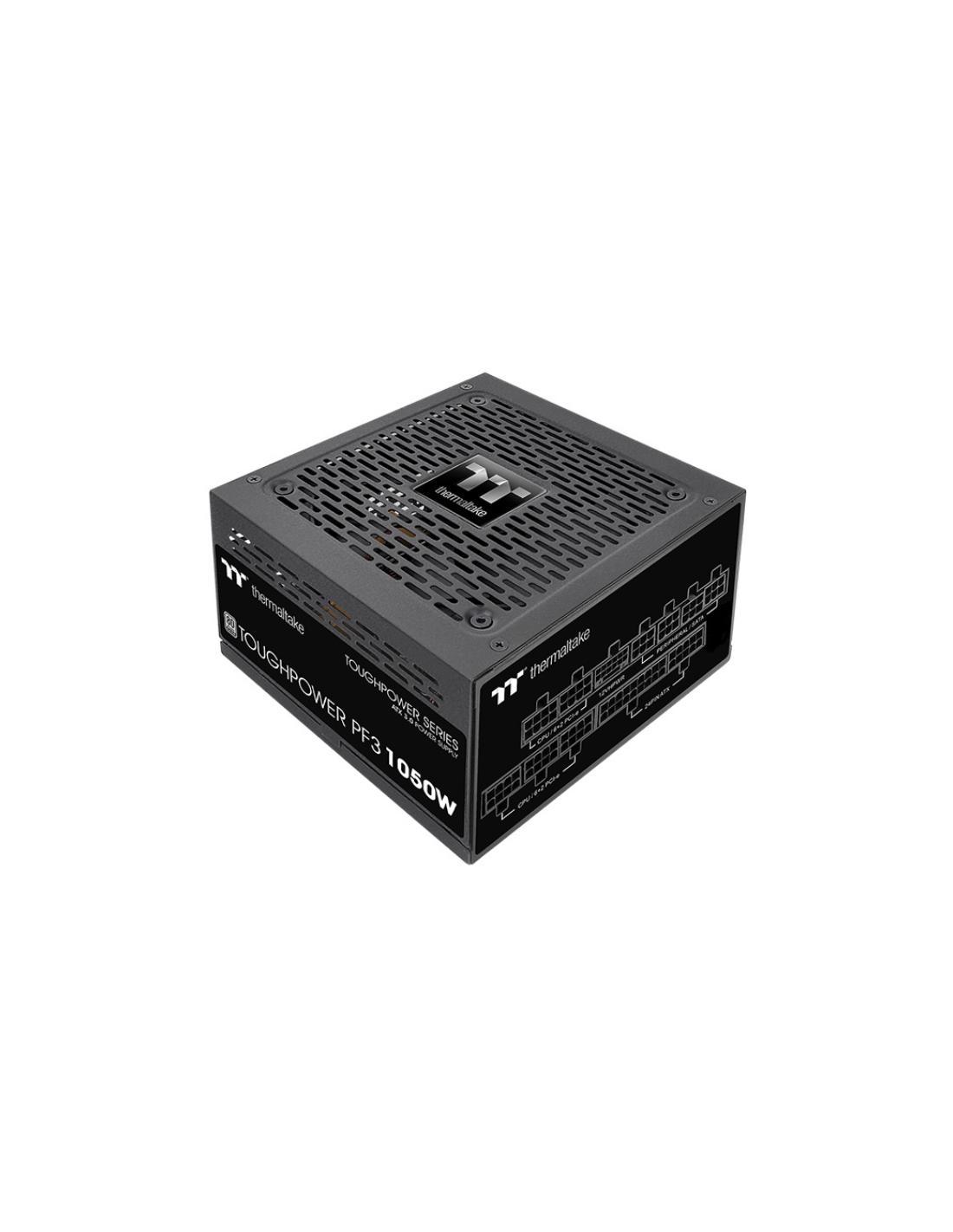 Thermaltake Toughpower PF3. Potencia total: 1050 W, Voltaje de entrada AC: 100 - 240 V, Frecuencia de entrada AC: 50/60 Hz. Alimentador de energía para tarjeta madre: 24-pin ATX, Longitud del cable de alimentación de la placa base: 60 cm, Longitud del cable de alimentación SATA: 150,500 mm. Utilizar con: PC, Factor de forma de fuente de alimentación (PSU): ATX, Certificación 80 PLUS: 80 PLUS Platinum. Color del producto: Negro, Tipo de enfriamiento: Activo, Diámetro de ventilador: 12 cm. Cables incluidos: P