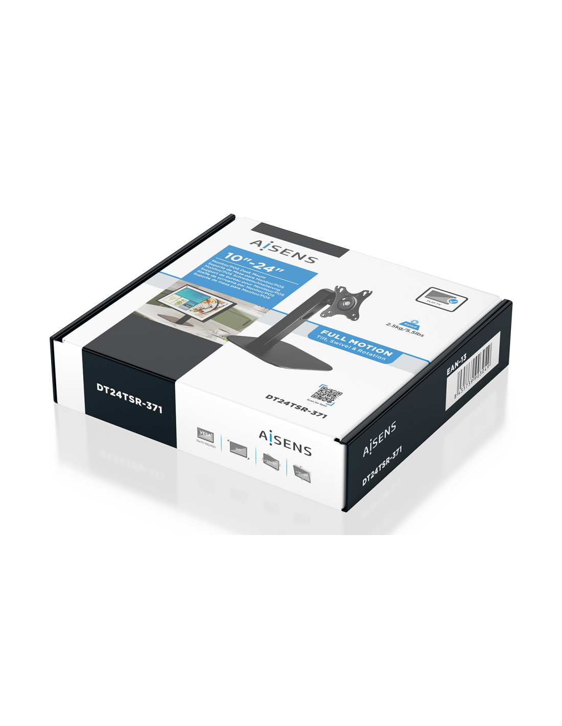 AISENS Soporte de Mesa Eco Giratorio e Inclinable Para Monitor/POS 2.5kg de 10"-24", Negro. Capacidad máxima de peso: 2,5 kg, Tamaño mínimo de pantalla: 25,4 cm (10"), Tamaño máximo de pantalla: 61 cm (24"), Compatibilidad con interfaz de montaje (min): 75 x 75 mm, Compatibilidad con interfaz de montaje (max): 100 x 100 mm. Ángulo de inclinación: -20 - 75°, Ángulo de giro (alcance): -30 - 30°, Ángulo de rotación: 360°. Color del producto: Negro