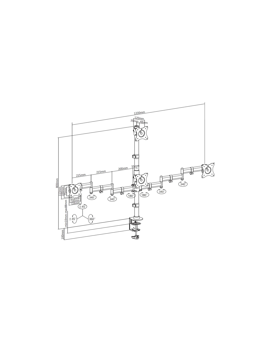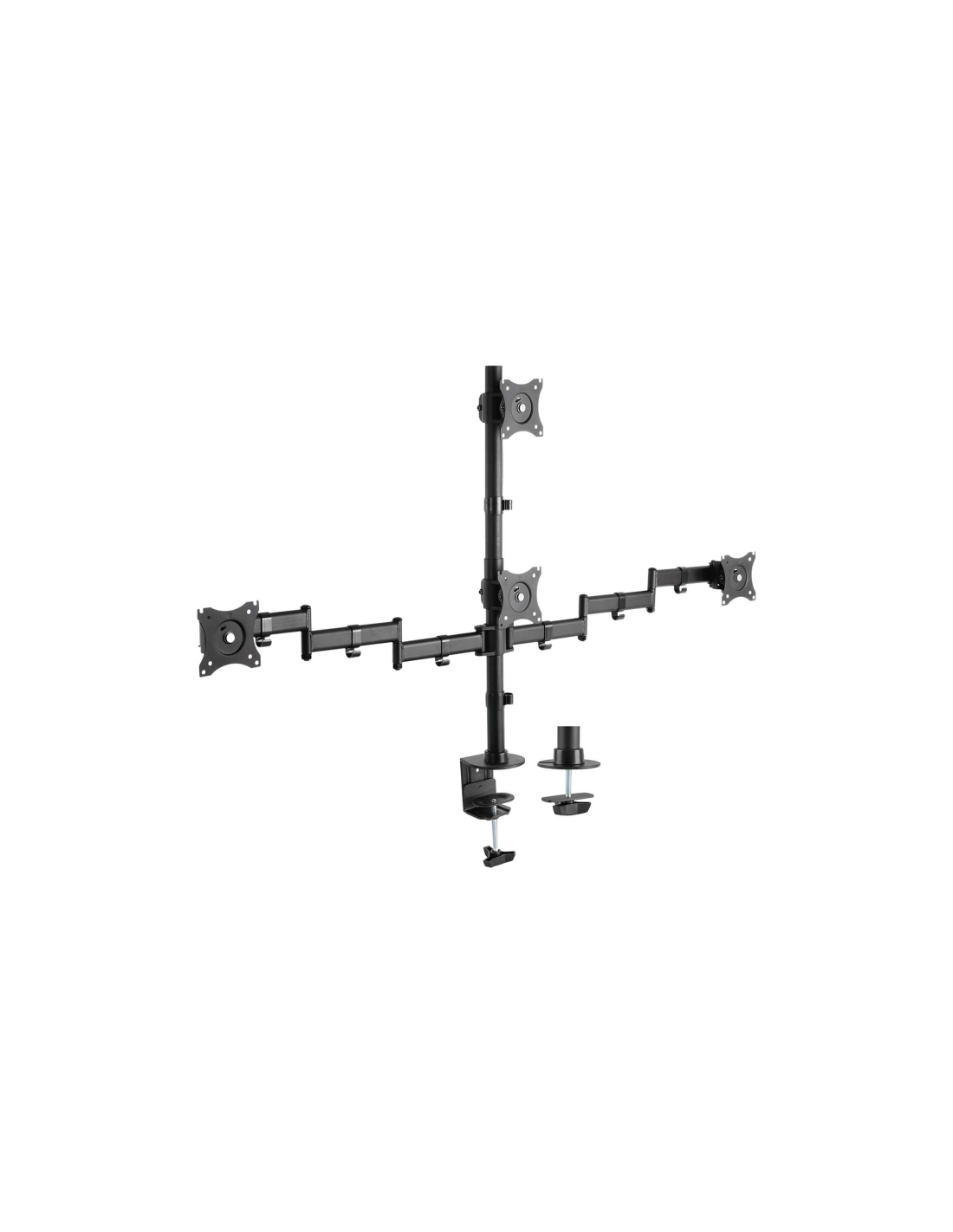 AISENS Soporte de Mesa Eco Giratorio e Inclinable para 4 Monitores 8kg (4 Pivotes, 2 Brazos) de 13"-27", Negro. Capacidad máxima de peso: 32 kg, Tamaño mínimo de pantalla: 33 cm (13"), Tamaño máximo de pantalla: 68,6 cm (27"), Compatibilidad con interfaz de montaje (min): 75 x 75 mm, Compatibilidad con interfaz de montaje (max): 100 x 100 mm. Ángulo de inclinación: -45 - 45°, Ángulo de giro (alcance): -45 - 45°, Ángulo de rotación: 180°. Color del producto: Negro