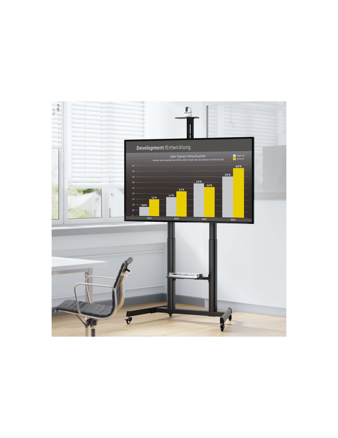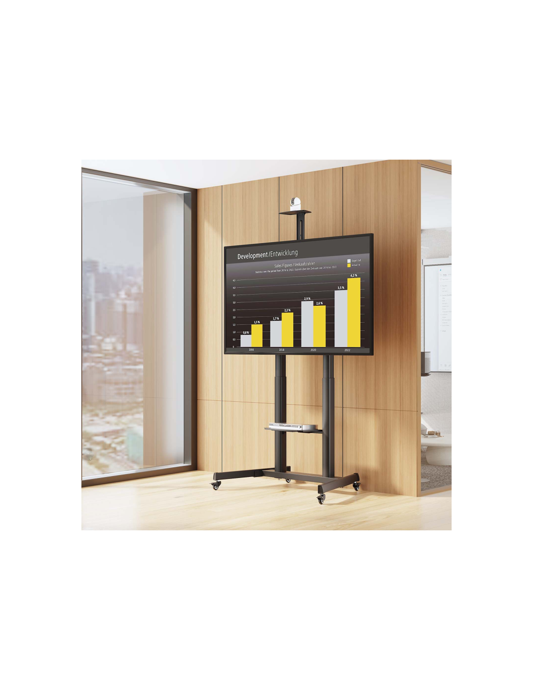 > Soporte de suelo eco con rueda y manivela, bandeja para DVD y soporte de cámara para monitor/TV de 60”-100”