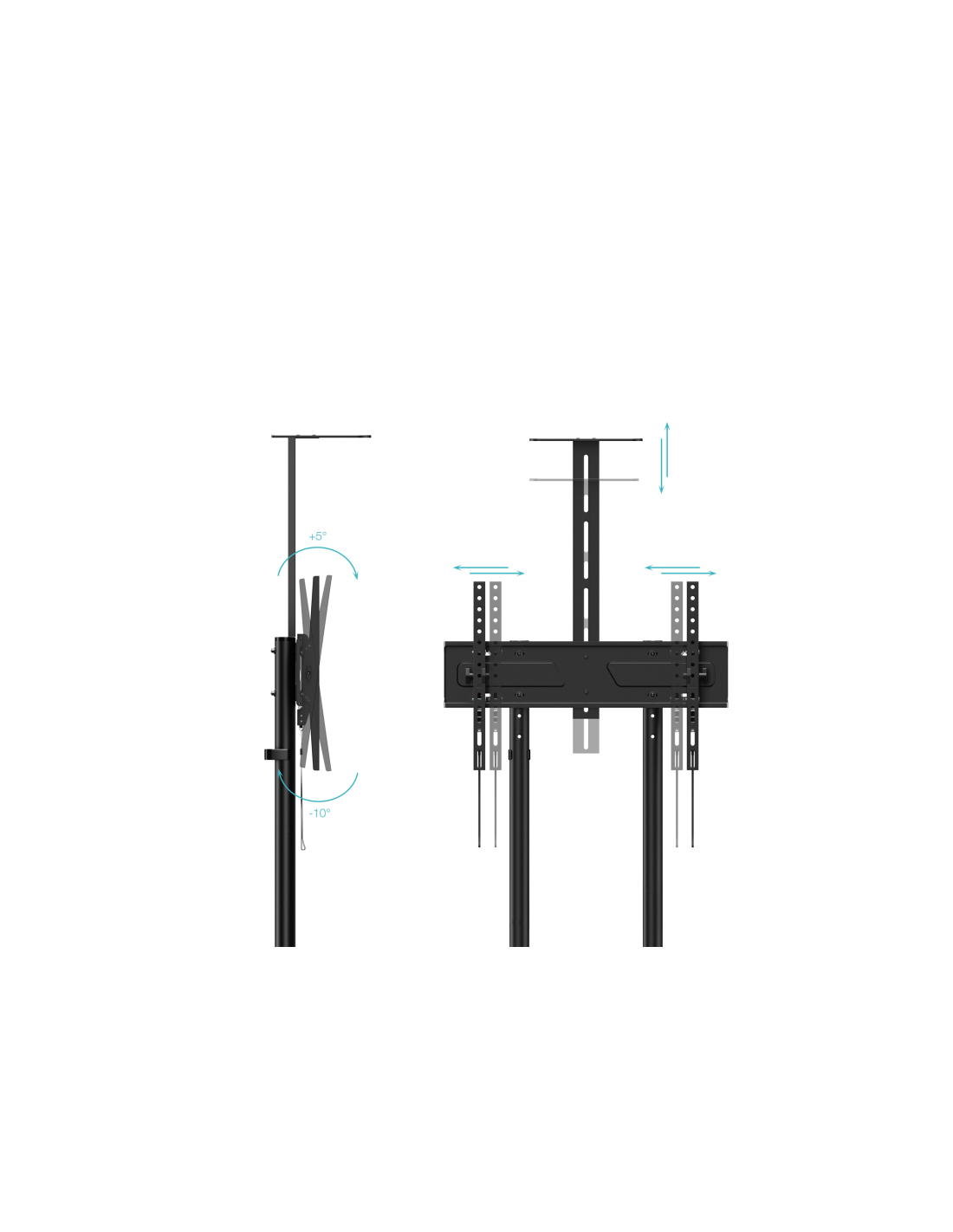 Soporte de suelo fabricado en acero de alta calidad, con altura e inclinación ajustables, dos bandejas: una inferior y otra superior; ruedas con sistema de bloqueo y gestión de cables integrado.