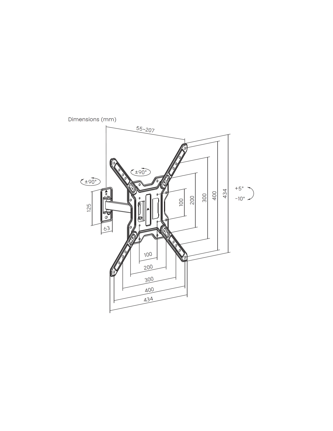 > VESA Máximo: 400x400mm (Compatible con VESA de 100×100, 100×200, 200×100, 200×200, 200×300, 300×200, 200×400, 400×200, 300×300, 400×300, 400x400mm)