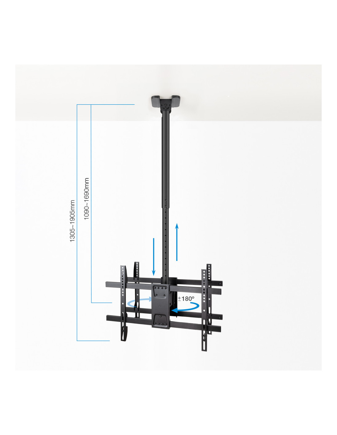 Cuando lo que se necesita es hacer espacio sin sacrificar el tamaño de la pantalla, nuestro soporte de techo es tu mejor aliado. Instala tus pantallas rápidamente y disfruta de todo el espacio libre que vas a ganar.