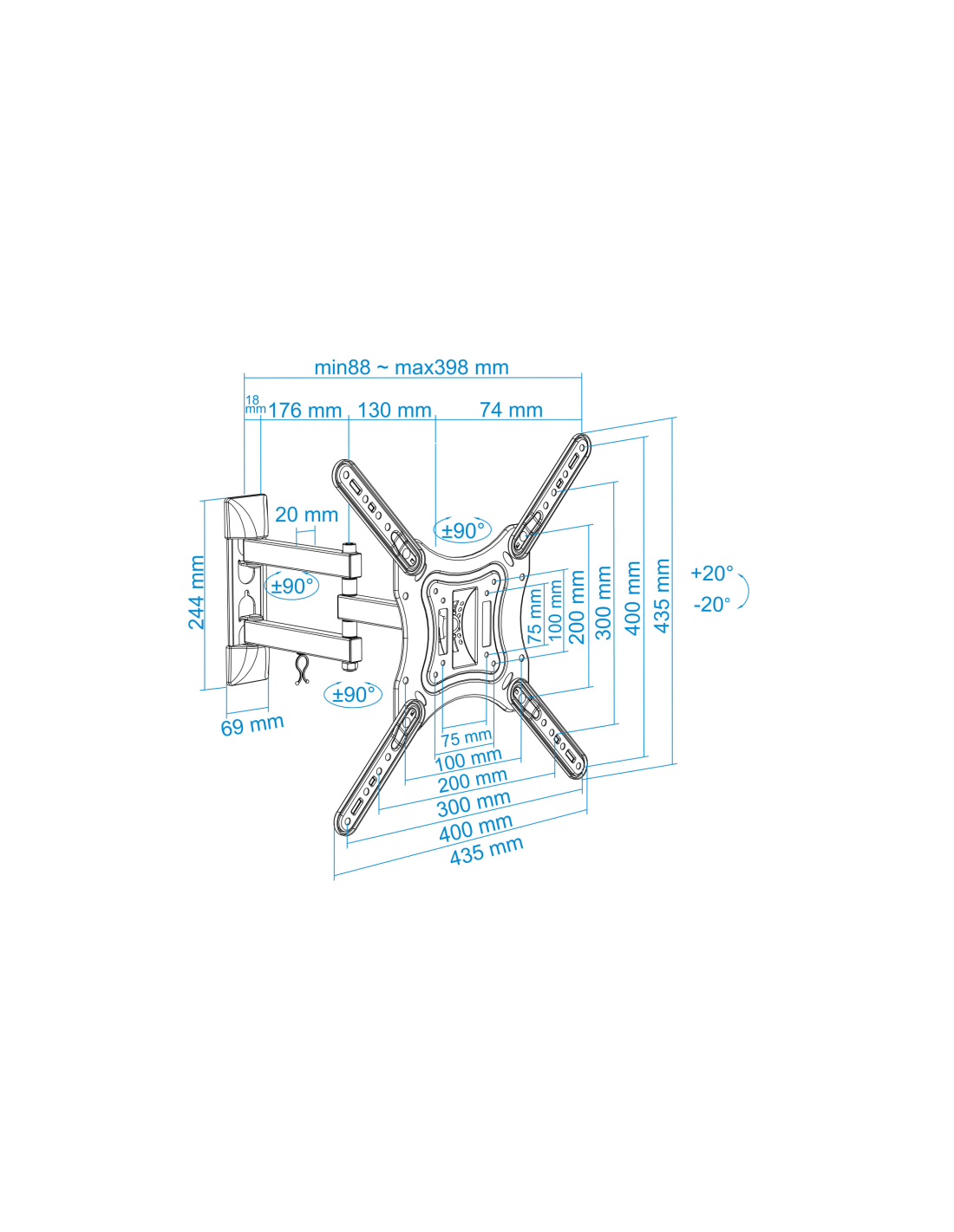 - Soporte metálico giratorio e inclinable para monitor / TV LCD, PLASMA y LED de 3 pivotes (23” – 55”) VESA Máximo: 400x400mm / Compatible con los formatos de fijación de pantalla VESA 75x75mm,100x100mm, 200x100mm, 200x200mm, 400x200mm, 300x300mm y 400x400mm