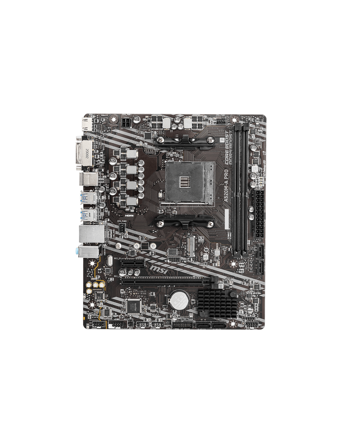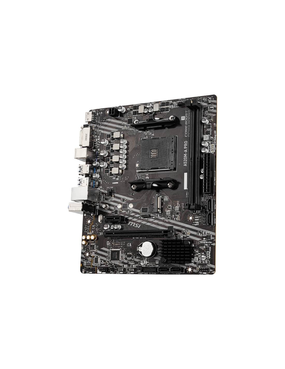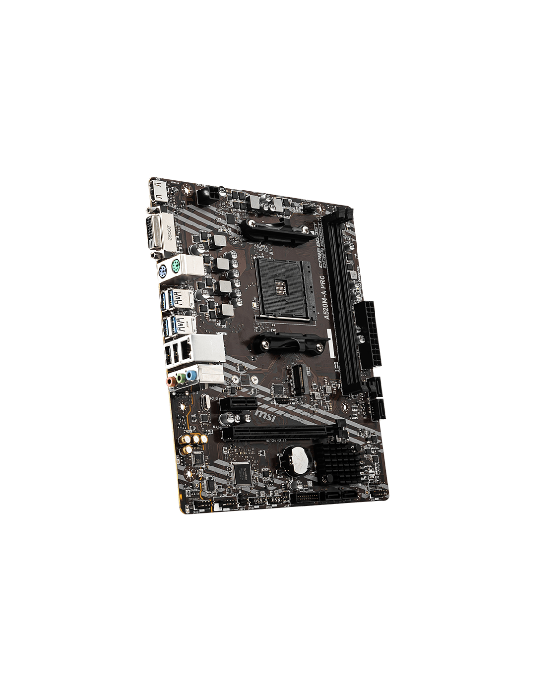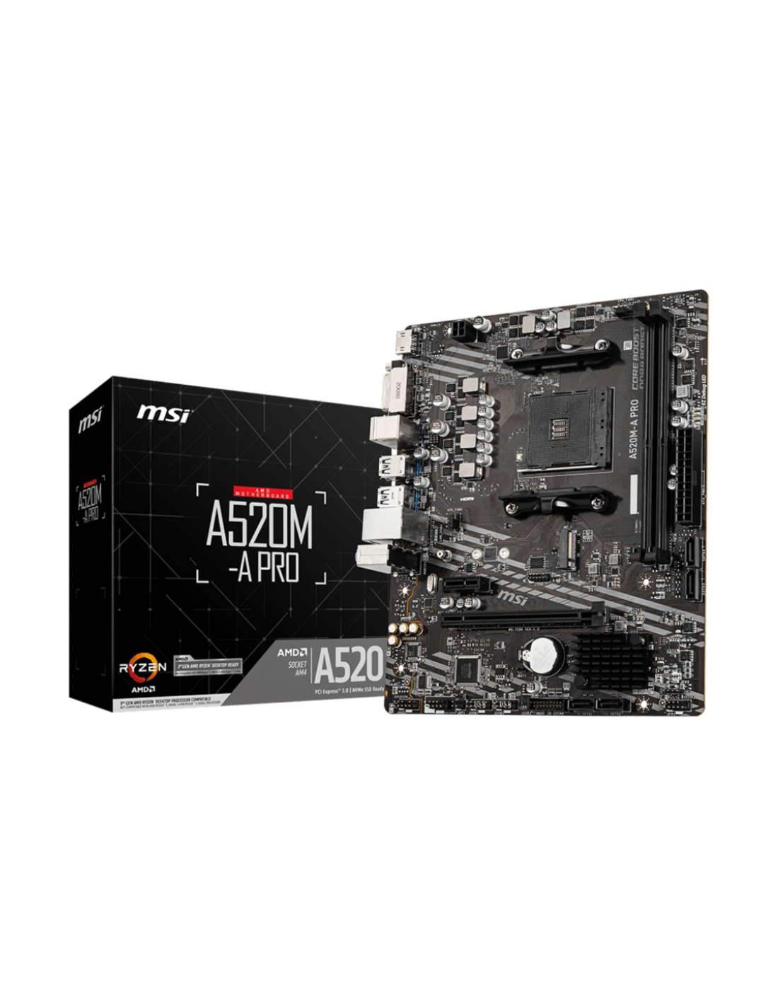 MSI A520M-A PRO. Fabricante de procesador: AMD, Socket de procesador: Zócalo AM4, Procesador compatible: AMD Ryzen 3000 Series. tipos de memoria compatibles: DDR4-SDRAM, Memoria interna máxima: 64 GB, Tipo de ranuras de memoria: DIMM. Interfaces de disco de almacenamiento soportados: PCI Express 3.0, SATA, Tipos de unidades de almacenamiento admitidas: HDD & SSD, Niveles RAID: 0, 1, 10. Máxima resolución: 4096 x 2160 Pixeles. Tipo de interfaz ethernet: Gigabit Ethernet, Controlador LAN: Realtek RTL8111H