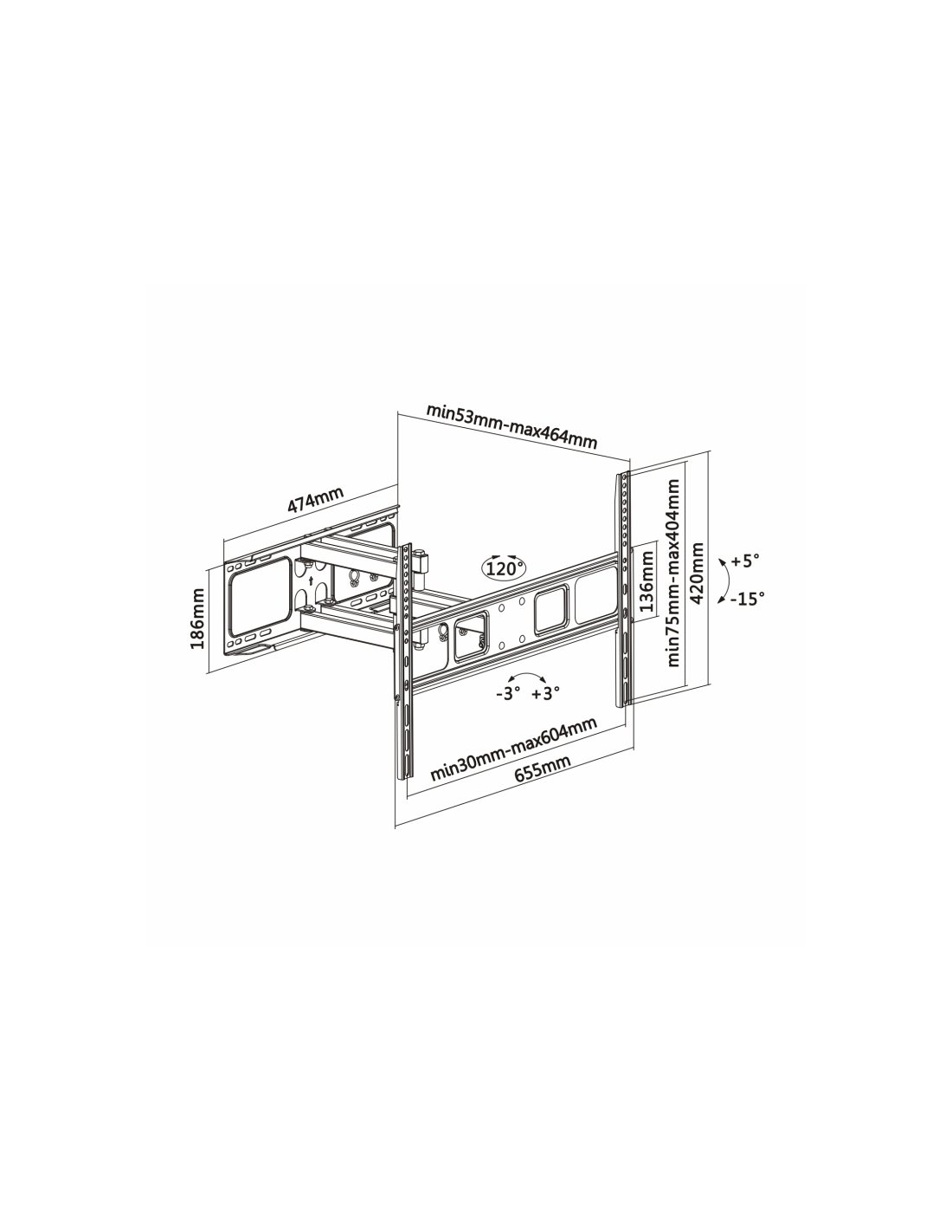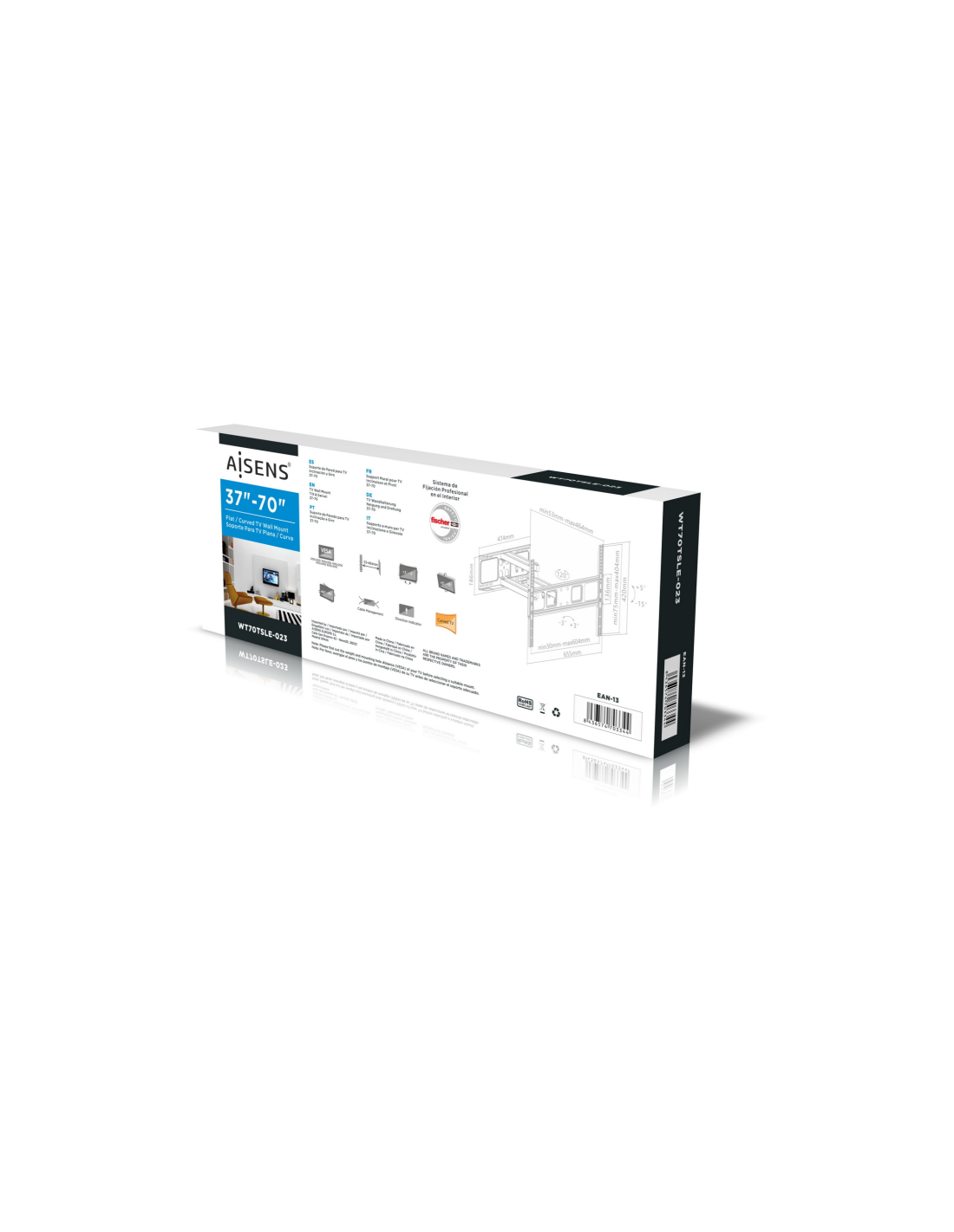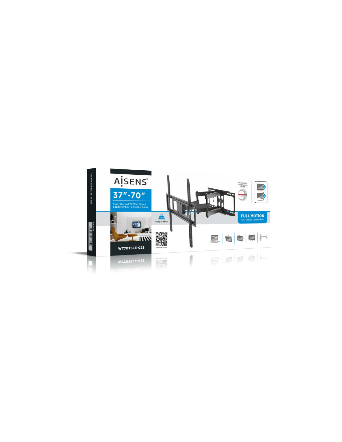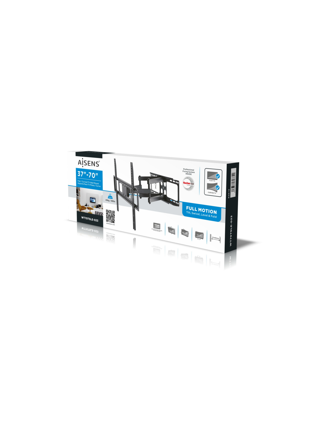 AISENS WT70TSLE-023. Capacidad máxima de peso: 40 kg, Tamaño mínimo de pantalla: 94 cm (37"), Tamaño máximo de pantalla: 177,8 cm (70"), Compatibilidad con interfaz de montaje (min): 200 x 200 mm, Compatibilidad con interfaz de montaje (max): 600 x 400 mm. Ángulo de inclinación: -15 - 5°, Ángulo de rotación: 60°, Distancia a la pared (min): 5,3 cm, Distancia a la pared (max): 46,4 cm. Color del producto: Negro