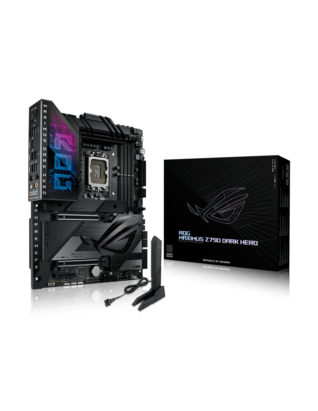 ASUS ROG MAXIMUS Z790 DARK HERO. Fabricante de procesador: Intel, Socket de procesador: LGA 1700, Procesador compatible: Intel® Celeron®, Intel® Core™ i3, Intel® Core™ i5, Intel® Core™ i7, Intel® Core™ i9,.... tipos de memoria compatibles: DDR5-SDRAM, Memoria interna máxima: 128 GB, Tipo de ranuras de memoria: DIMM. Interfaces de disco de almacenamiento soportados: M.2, SATA III, Tipos de unidades de almacenamiento admitidas: HDD & SSD, Niveles RAID: 0, 1, 5, 10. Tipo de interfaz ethernet: 2.5 Gigabit Ethernet, Estándar Wi-Fi: Wi-Fi 7 (802.11be), Wi-Fi estándares: 802.11a, 802.11b, 802.11g, Wi-Fi 4 (802.11n), Wi-Fi 5 (802.11ac), Wi-Fi 6 (802.11ax), Wi-Fi 6E.... Componente para: PC, Factor de forma: ATX, Familia del chipset: Intel