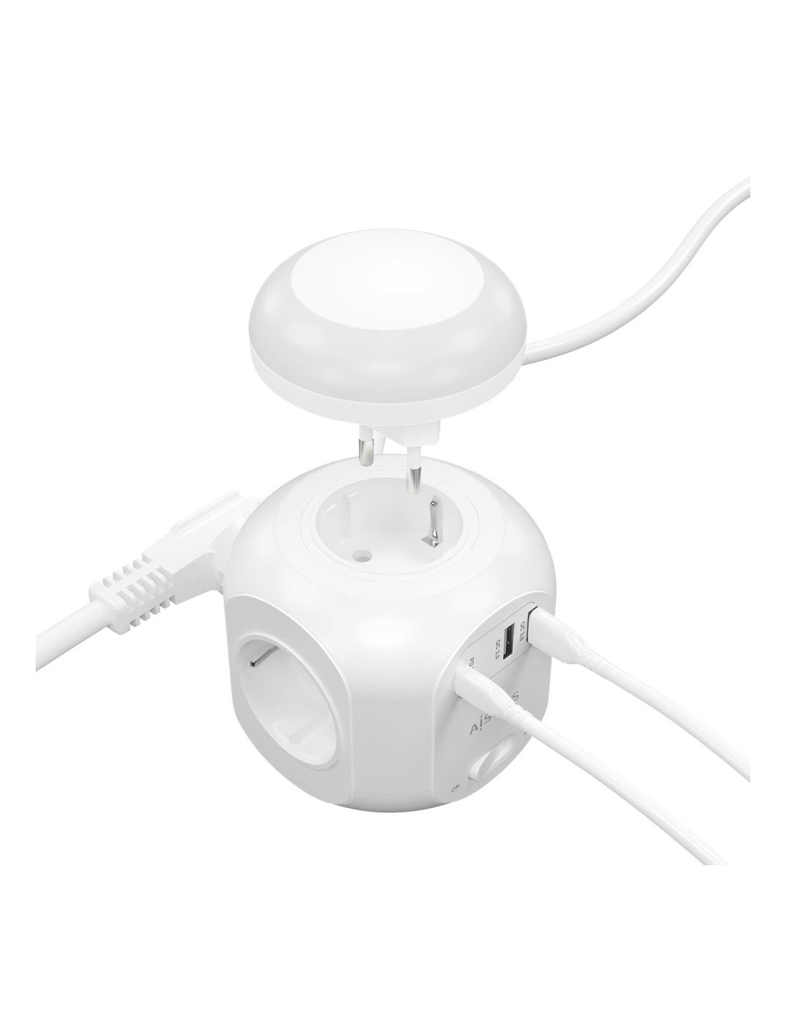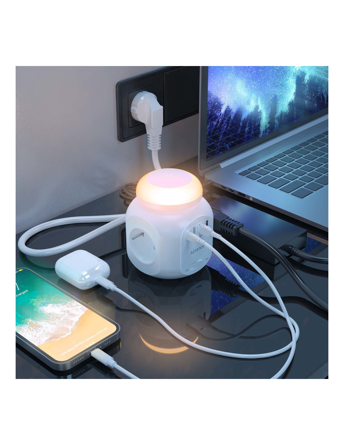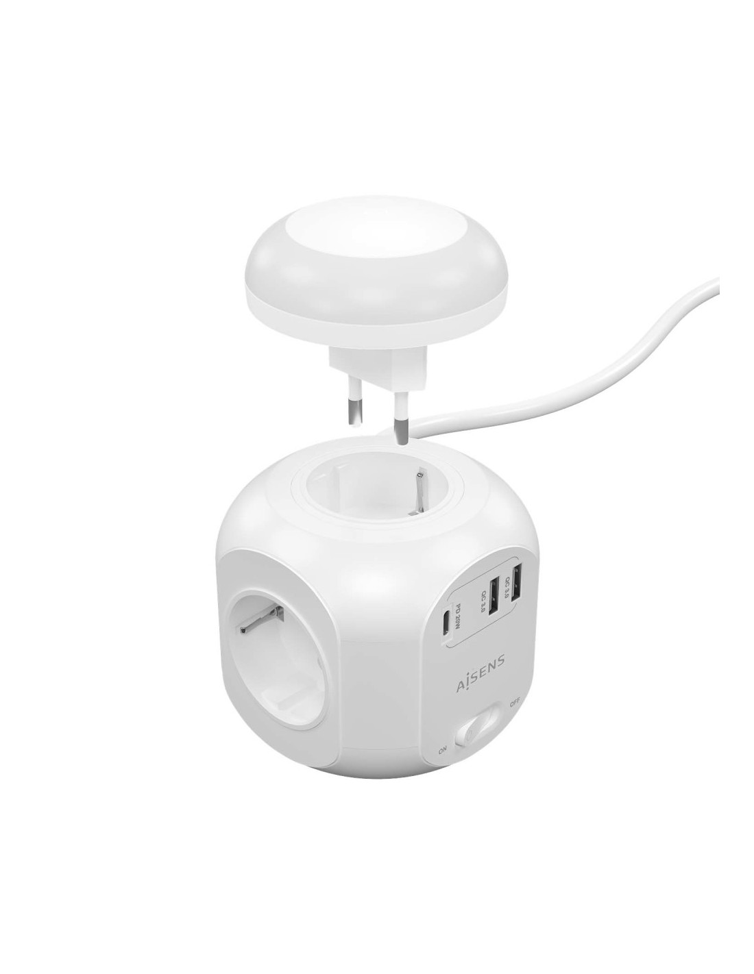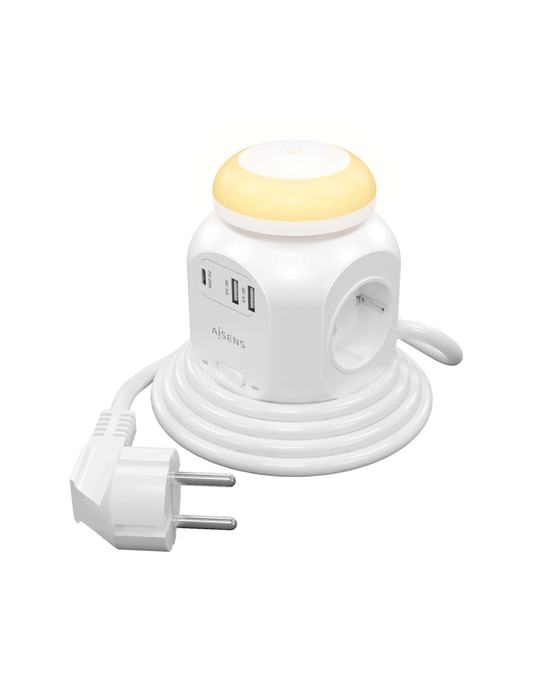 AISENS® – Base múltiple multifunción de sobremesa (regleta de enchufes) con interruptor y 4 tomas Schuko, 1 puerto USB-C 20W PD3.0, 2 puertos USB-A 18W QC3.0 y una luz nocturna incorporada. El cable de alimentación tiene una longitud de 1.8 metros y una sección de 3×1.0mm2.