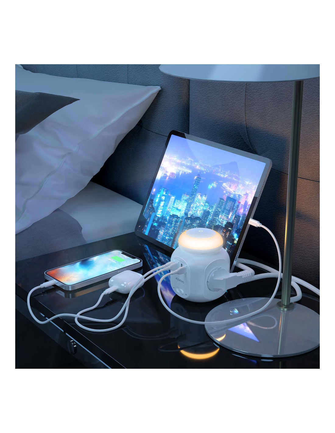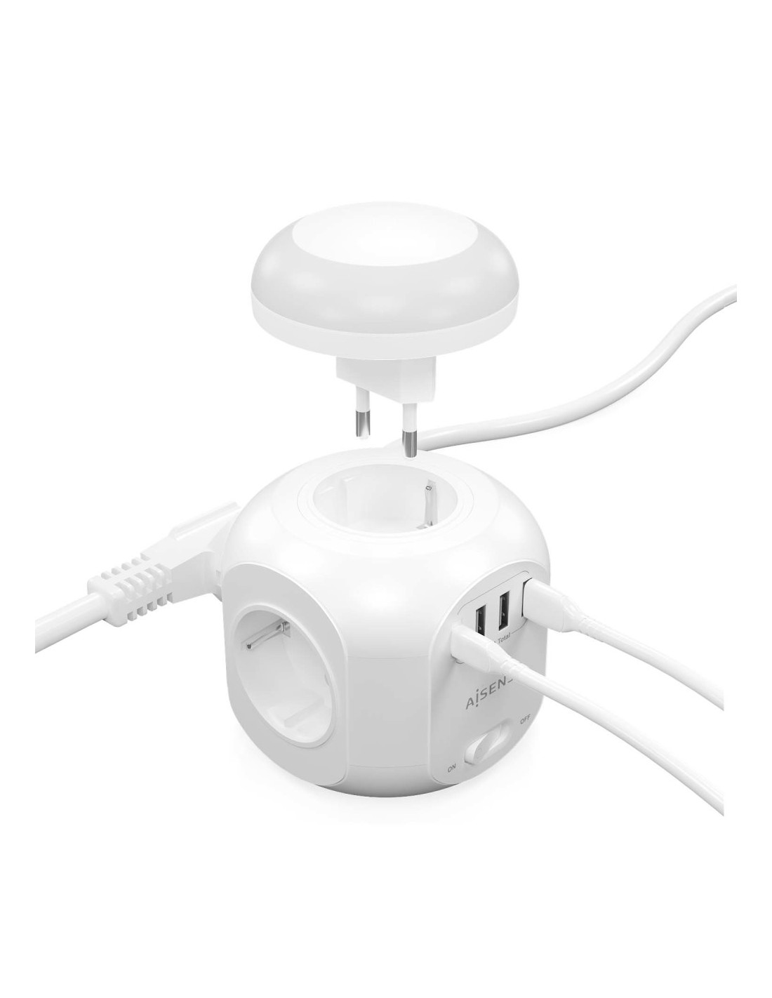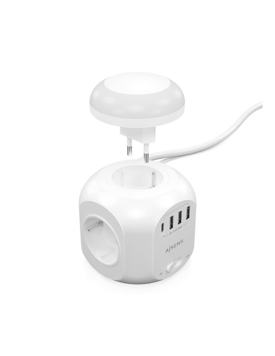 AISENS® – Base múltiple multifunción de sobremesa (regleta de enchufes) con interruptor y 4 tomas Schuko, 1 puerto USB-C, 3 puertos USB-A y una luz nocturna incorporada. El cable de alimentación tiene una longitud de 1.8 metros y una sección de 3×1.0mm2.