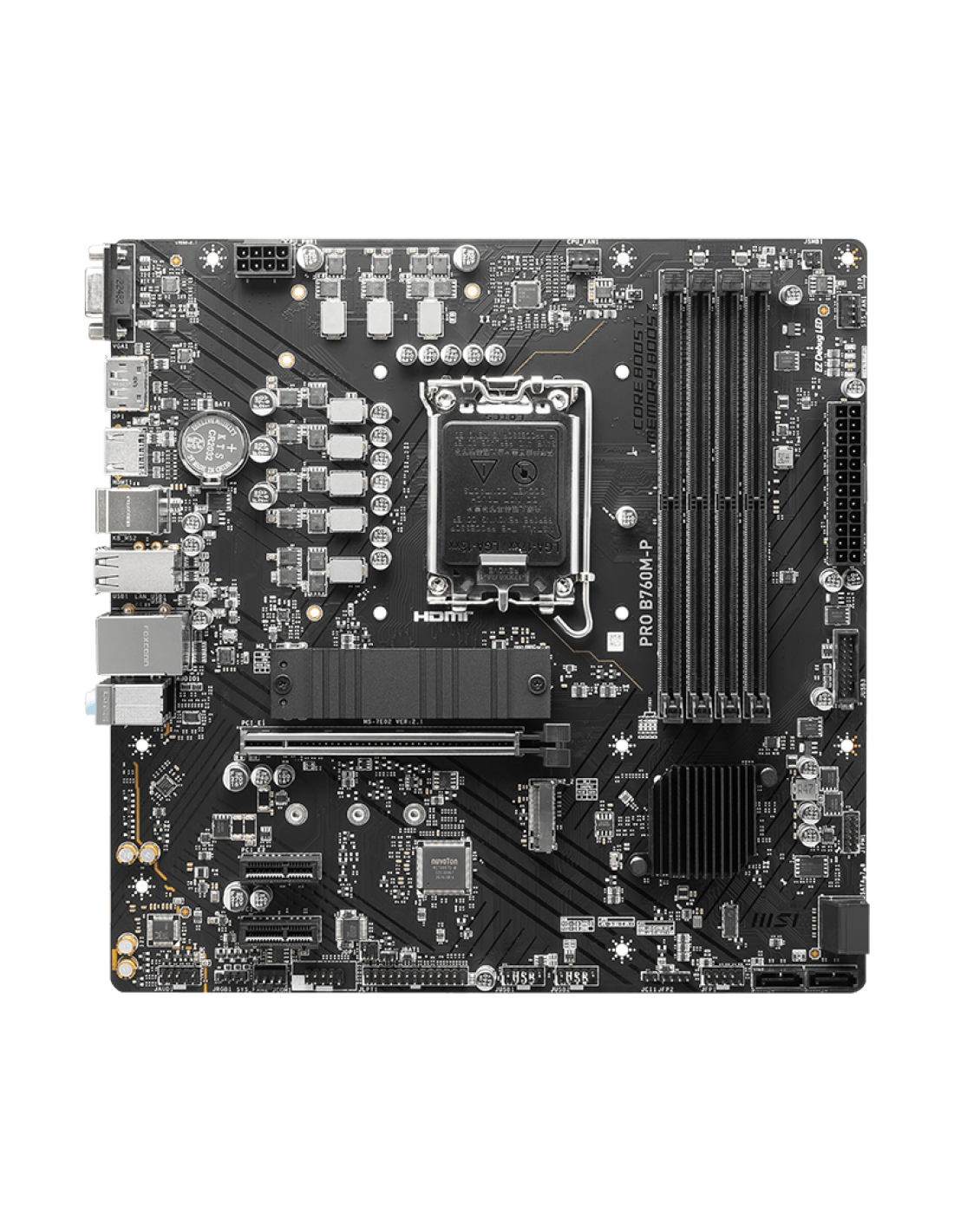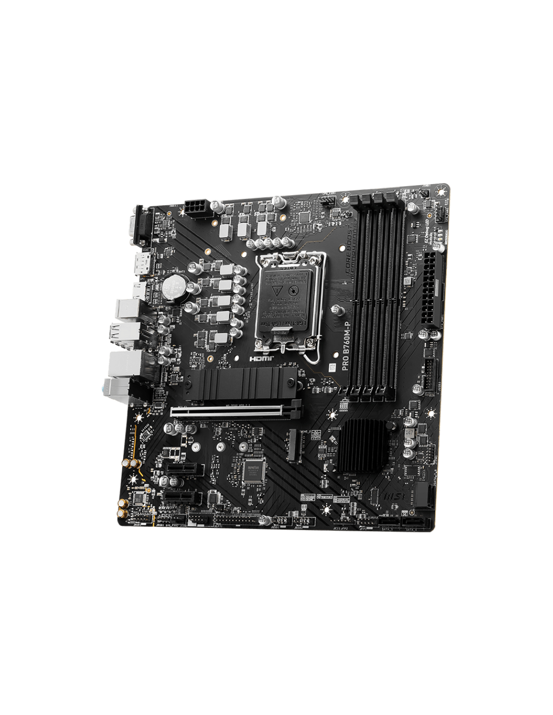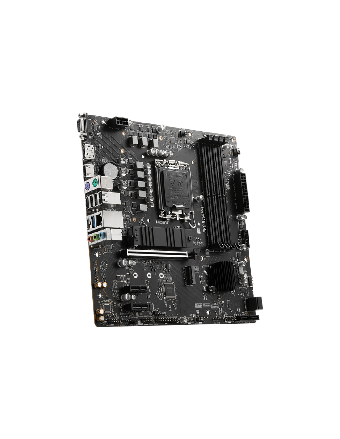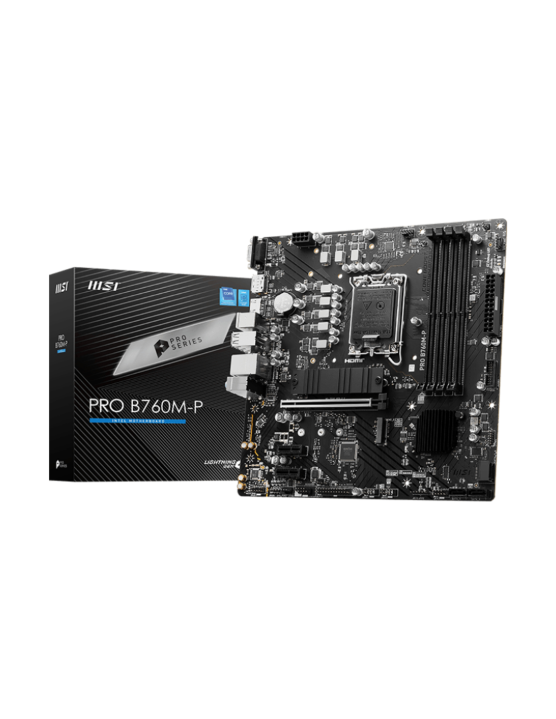 MSI PRO B760M-P. Fabricante de procesador: Intel, Socket de procesador: LGA 1700, Procesador compatible: Intel® Celeron®, Intel® Pentium® Gold. tipos de memoria compatibles: DDR5-SDRAM, Memoria interna máxima: 192 GB, Compatibilidad de ECC: No-ECC. Interfaces de disco de almacenamiento soportados: SATA III, Tipos de unidades de almacenamiento admitidas: HDD & SSD, Niveles RAID: 0, 1, 5, 10. Tipo de interfaz ethernet: Gigabit Ethernet, Controlador LAN: Realtek RTL8111H. Componente para: PC, Factor de forma: