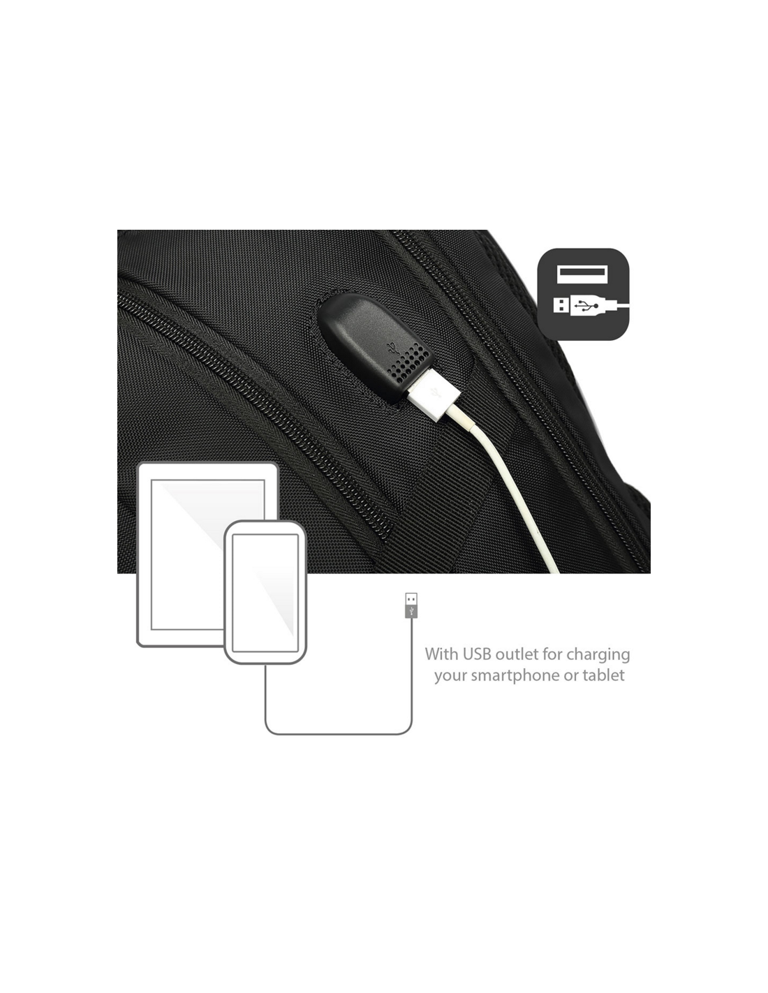 La mochila tiene una salida USB integrada para cargar su teléfono inteligente. Conecte un banco de energía y guarde el banco de energía en la bolsa. Tome el cable de carga de sus dispositivos móviles y conecte este cable a la toma USB. Puede cargar su teléfono inteligente mientras viaja.