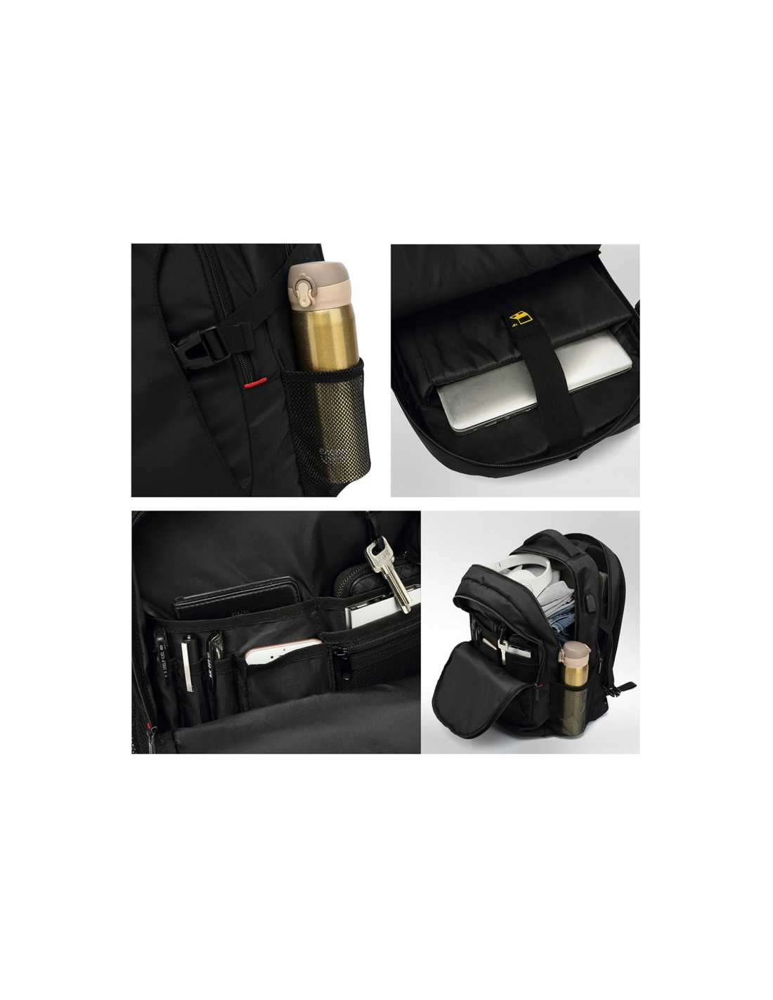 El compartimento separado para notebook protege su notebook hasta 15.6 pulgadas contra daños. La mochila global está equipada con compartimentos especiales para su tableta, documentos, adaptador de corriente, mouse y otros periféricos. Incluso su botella de agua se puede guardar en los bolsillos exteriores.