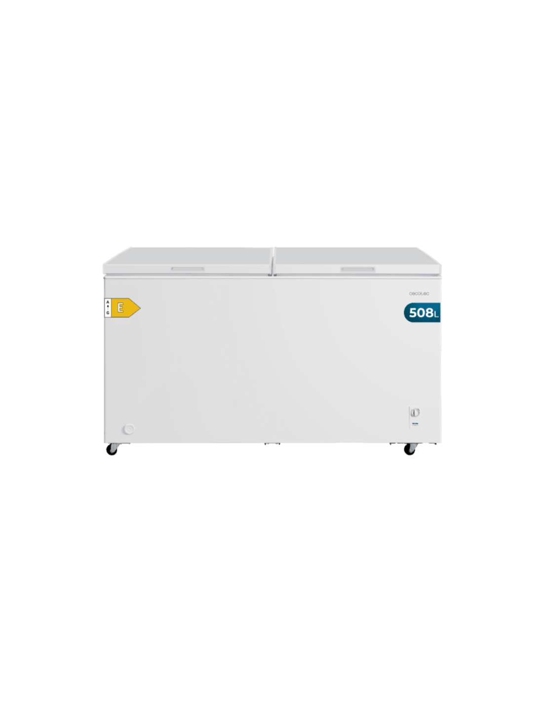 Cecotec Bolero CoolMarket Chest Duo 508M White E. Congelador, capacidad neta: 508 L, Clase climática: SN-T, Capacidad de congelación: 23 kg/24h, Nivel de ruido: 41 dB, Índice Star: 4*. Clase de eficiencia de energía: E, Consumo de energía anual: 298 kWh. Color del producto: Blanco