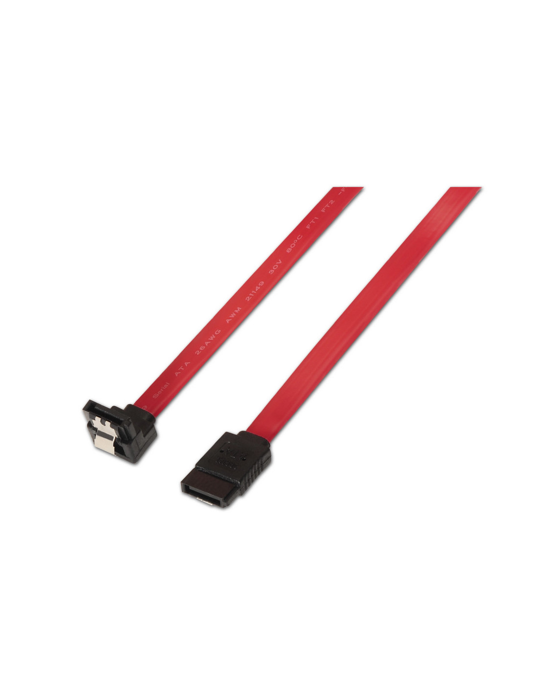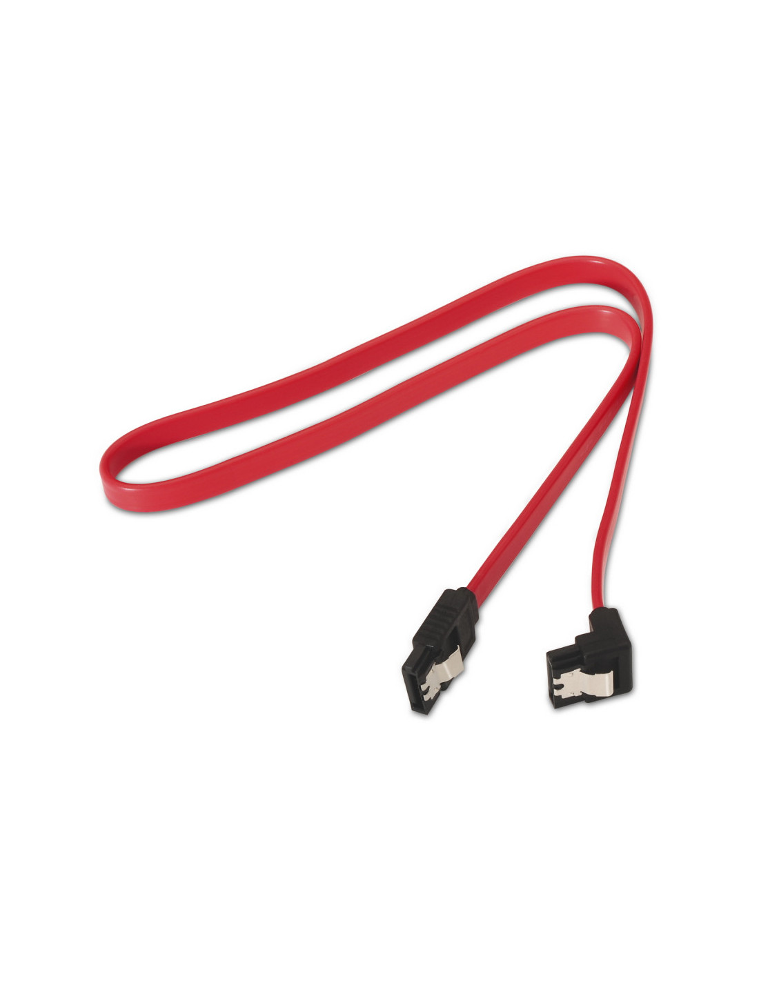 Cable SATA datos con anclajes para una conexión segura y acodado en un extremo para disco duro u otro dispositivo con interfaz SATA.