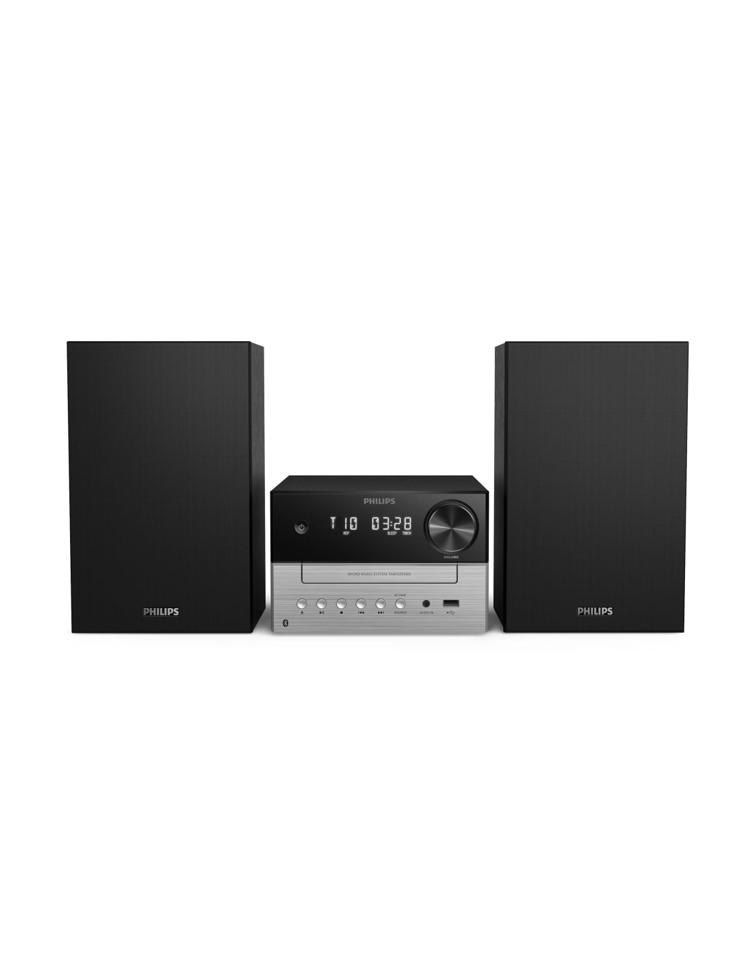 Philips TAM3205M2/77. Tipo: Microcadena de música para uso doméstico, Color del producto: Negro, Plata. Potencia estimada RMS: 20 W, Diámetro del woofer: 7,62 cm, Obstrucción: 6 O. Bandas de radio soportadas: FM, Tipo de sintonizador: Digital. Tipo de visualizador: LED. Entrada de audio: 3.5 mm