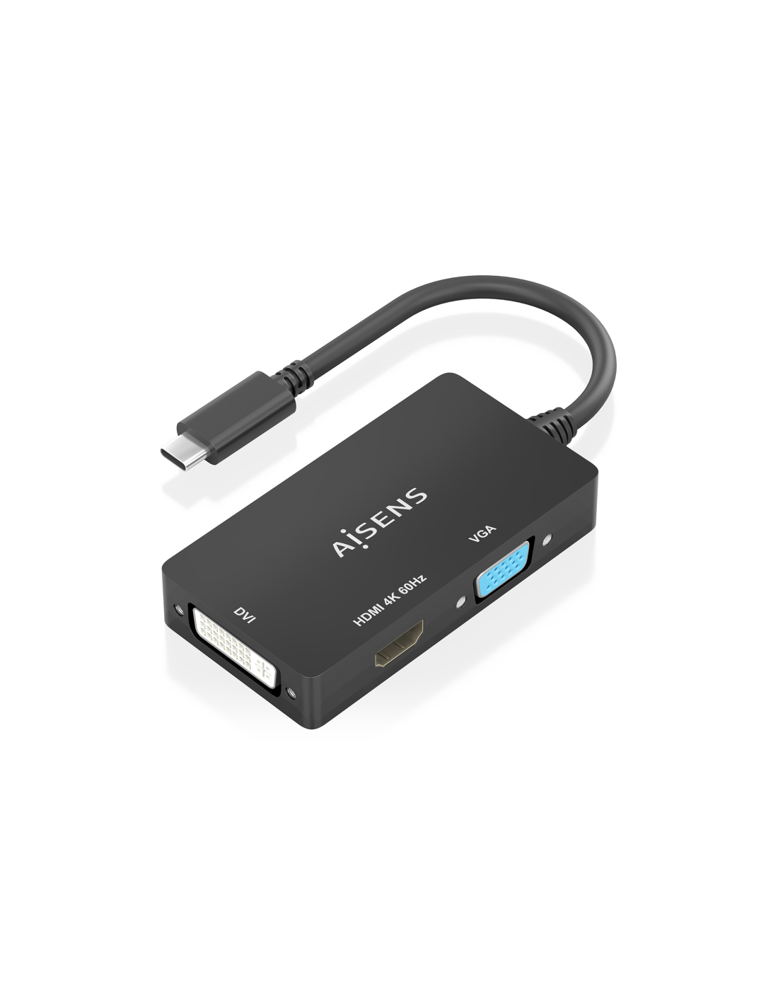 AISENS Conversor USB-C A DVI/HDMI/VGA, USB-C/M-DVI/H-HDMI/H-VGA/H, Negro, 15cm. Color del producto: Negro, Longitud de cable: 0,15 m. Máxima resolución de video: 3840 x 2160 Pixeles, Resoluciones de video: 1920 x 1080,3840 x 2160 Pixeles, Formato de vídeo soportado: 1080p. Interfaz de host: USB Tipo C, Interfaz de salida: DVI-I/VGA/HDMI. Ancho del paquete: 120 mm, Profundidad del paquete: 160 mm, Altura del paquete: 10 mm. Ancho de la caja principal: 460 mm, Longitud de la caja: 300 mm, Alto de la caja principal: 300 mm