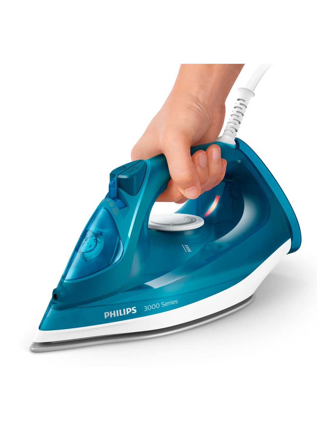 Nuestra plancha de vapor de la serie 3000 facilita el planchado gracias a su potente golpe de vapor que elimina las arrugas más difíciles. La suela de cerámica garantiza un deslizamiento suave, mientras que el depósito de agua de 300 ml es lo suficientemente grande como para completar las pequeñas cargas de planchado sin necesidad de rellenarlo.