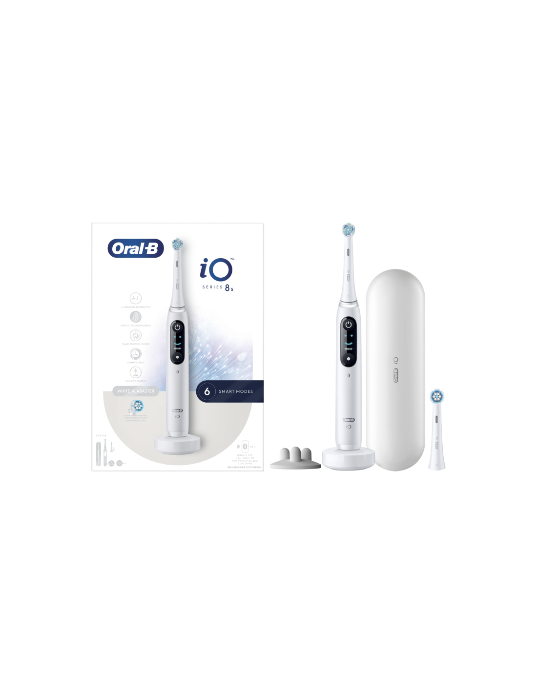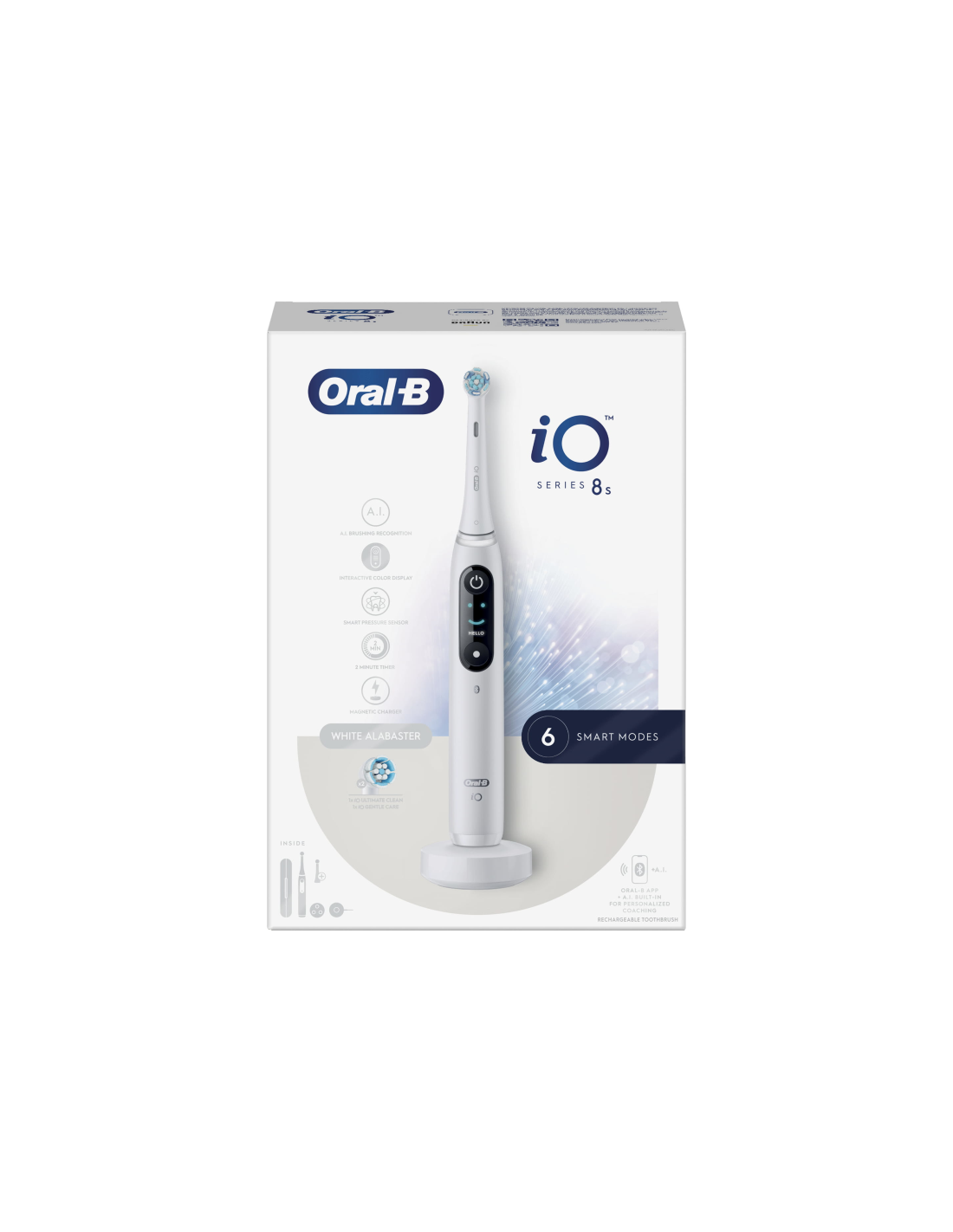 Oral-B iO 8S. Utilizar con: Adulto, Tipo de cepillo de dientes: Cepillo dental vibratorio, Modos del cepillo de dientes: Cuidados diarios, Limpieza profunda, Super sensitive, Cuidado de las encías, Sensible, Blanqueador. Fuente de energía: Batería, Tipo de batería: Batería integrada, Tiempo de recarga de la batería: 3 h. Tipo de embalaje: Caja. Número de empuñaduras incluidas: 1 pieza(s), Número de cabezales incluido: 2 pieza(s)