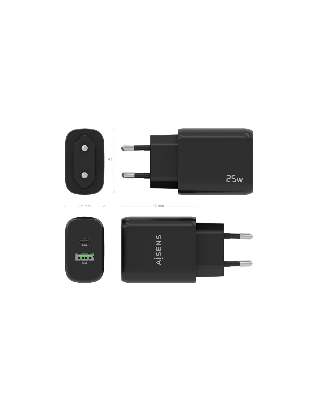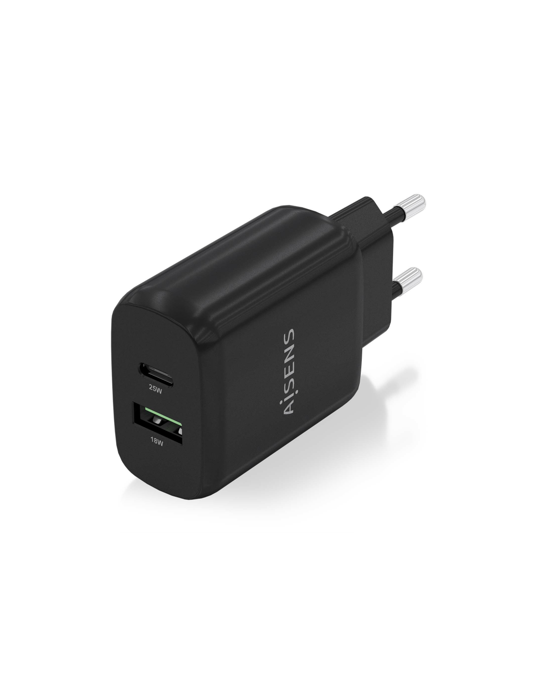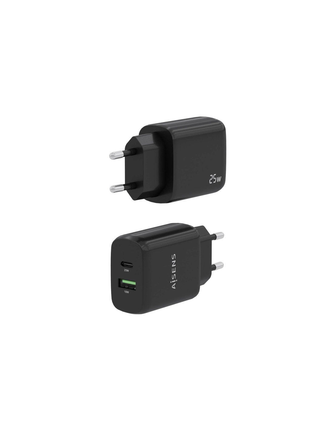 AISENS Cargador 25W, 1xUSB-C PD3.0, 1xUSB-A QC3.0, Negro. Tipo de cargador: Interior, Alimentación: Corriente alterna, Compatibilidad del cargador: Universal. Voltaje de entrada: 100 - 240 V, Voltaje de salida máximo: 12,27 V. Cantidad de puertos USB 2.0: 1, Número de puertos USB Tipo C: 1, Carga rápida, Funciones de protección de poder: Sobrecarga, Sobrecarga, Cortocircuito. Color del producto: Negro
