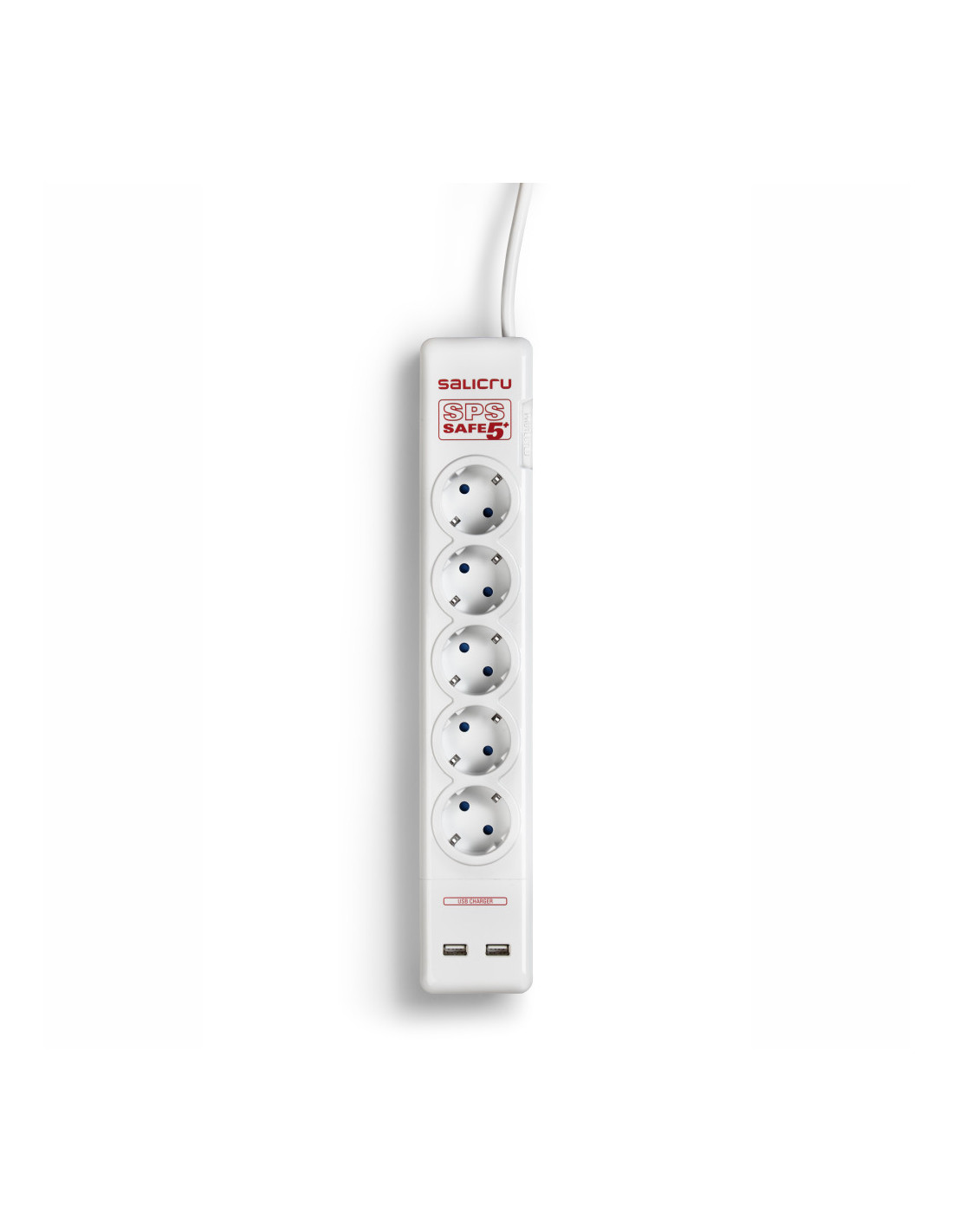 Salicru's SPS SAFE series is a complete range of multi-outlet power strip active electrical protectors, ideal for protecting office and home electronics. Featuring basic 3 and 6-outlet models, the SPS SAFE 3 and SPS SAFE 6, respectively, the SPS SAFE 7, model with 7 sockets, EMI/RFI filter and built-in cable collector, and the SPS SAFE 5++ and SPS SAFE Master with 5 sockets and 2 USB chargers for charging electronic devices. The SPS SAFE Master model also features, in addition to the EMI/RFI filter, a master/slave function to achieve significant savings by preventing load ‘vampire' consumption in standby.