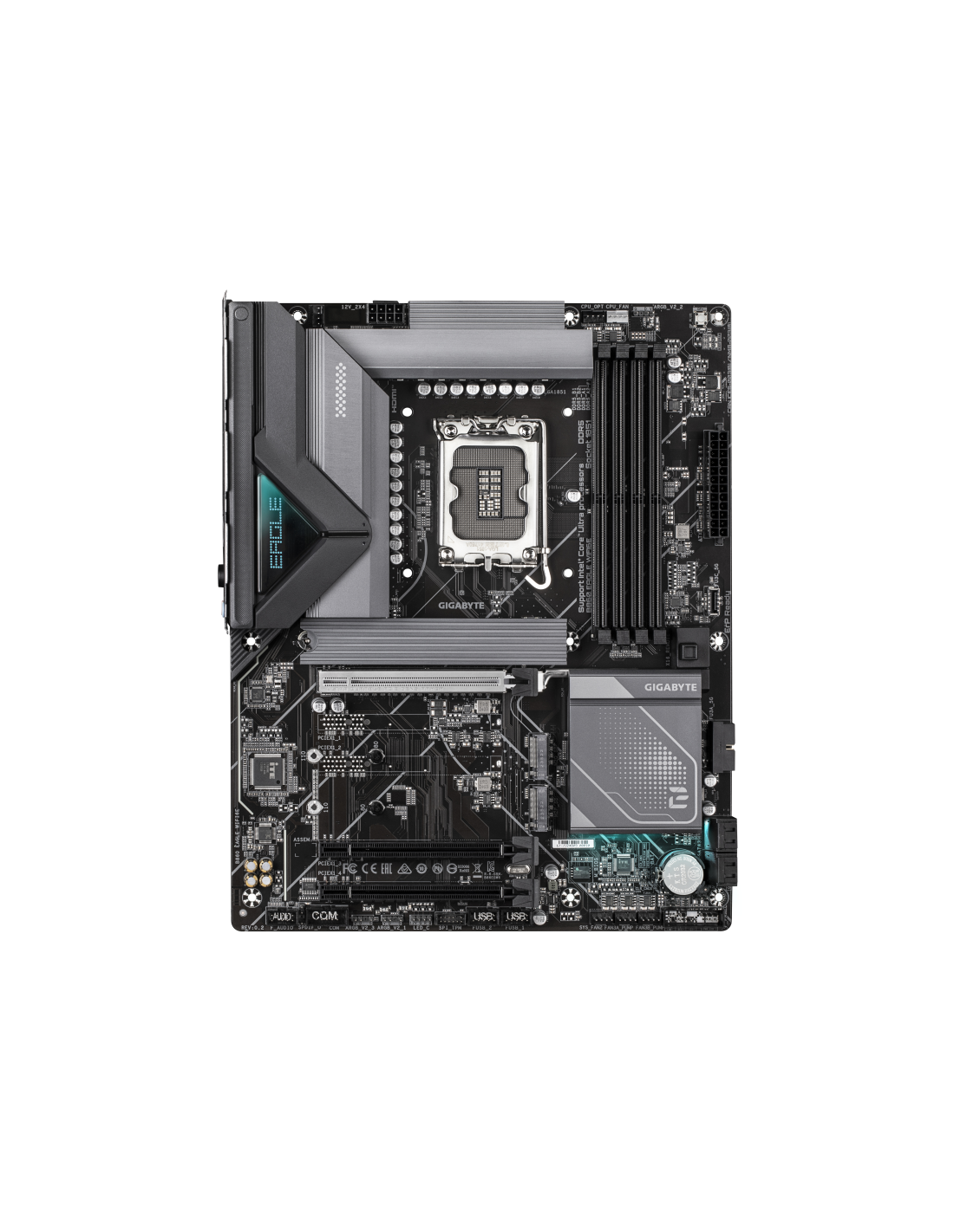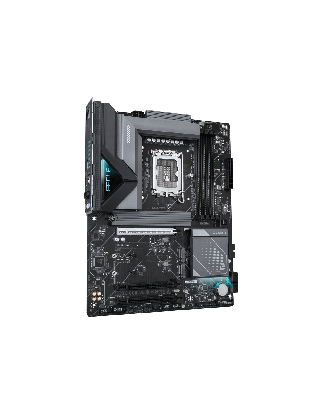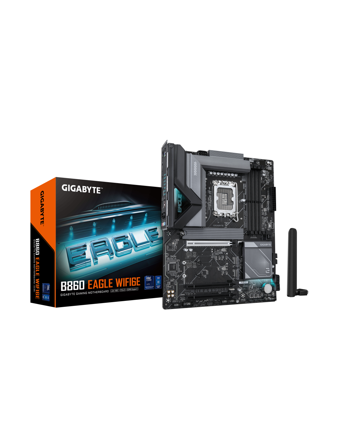 GIGABYTE B860 EAGLE WIFI6E Placa base - CPUs Intel Core Ultra, VRM de 12+1+2+1 fases, hasta 9066MHz DDR5, 1xPCIe 5.0 + 2xPCIe 4.0 M.2, LAN 2,5 GbE, WIFI 6E, USB 3.2 Gen 2x2. Fabricante de procesador: Intel, Socket de procesador: LGA 1851 (Socket V1), Procesador compatible: Intel Core Ultra (Serie 1), Intel Core Ultra (Series 2). tipos de memoria compatibles: DDR5-SDRAM, Memoria interna máxima: 256 GB, Tipo de ranuras de memoria: DIMM. Interfaces de disco de almacenamiento soportados: M.2, SATA III, Tipos de
