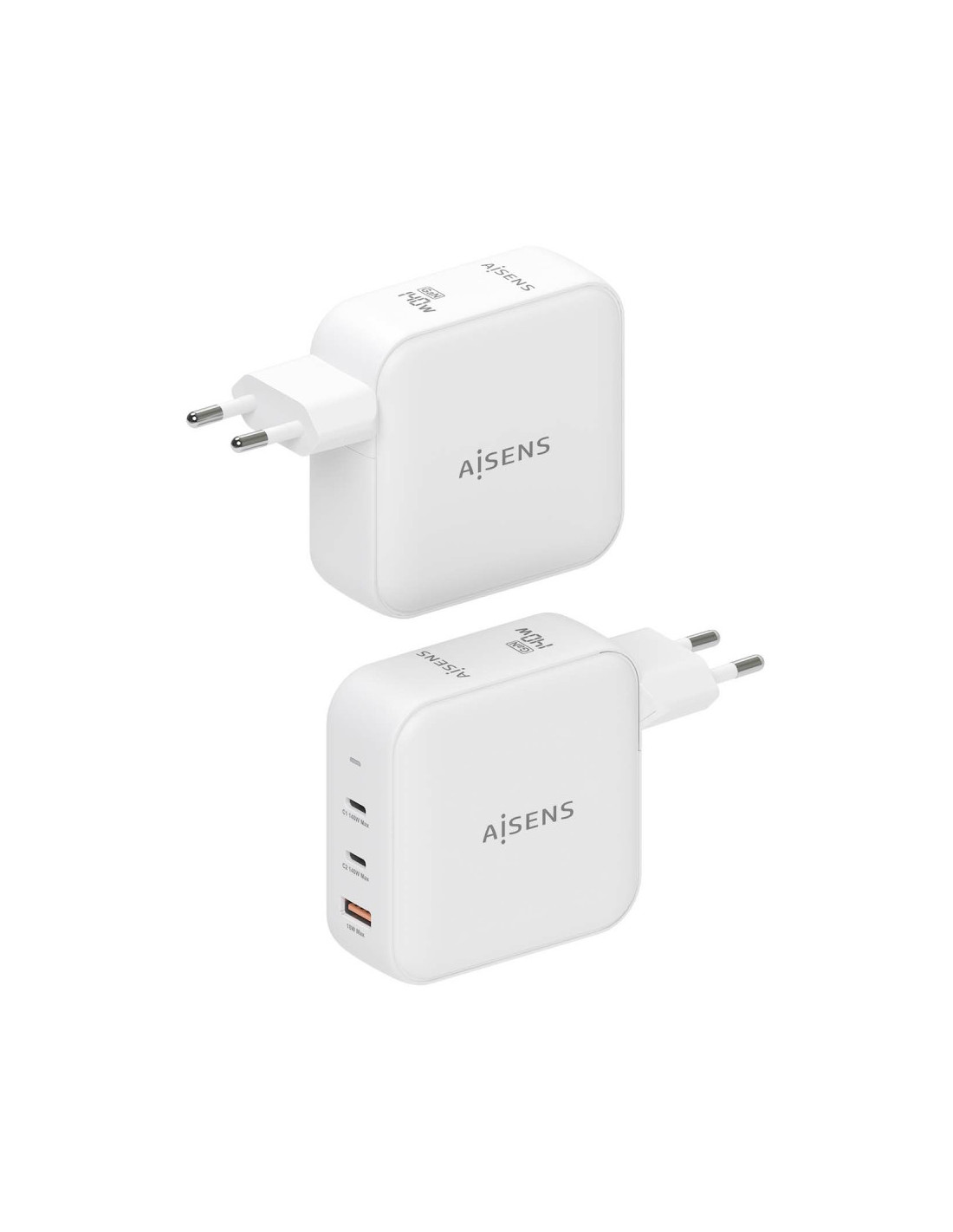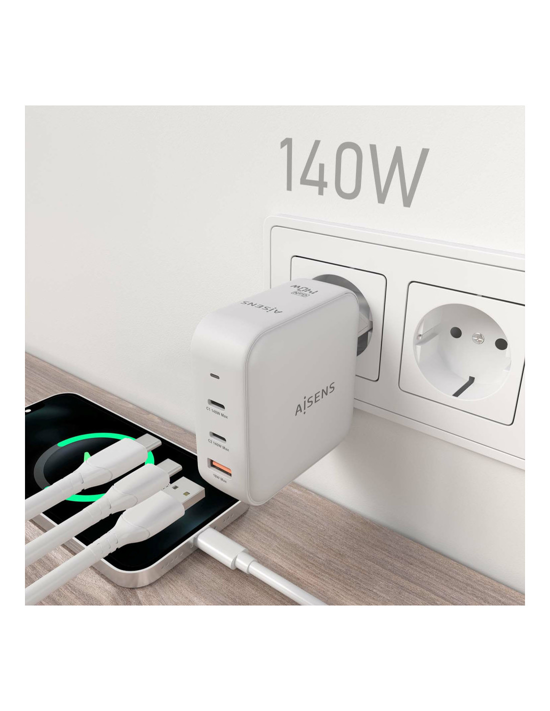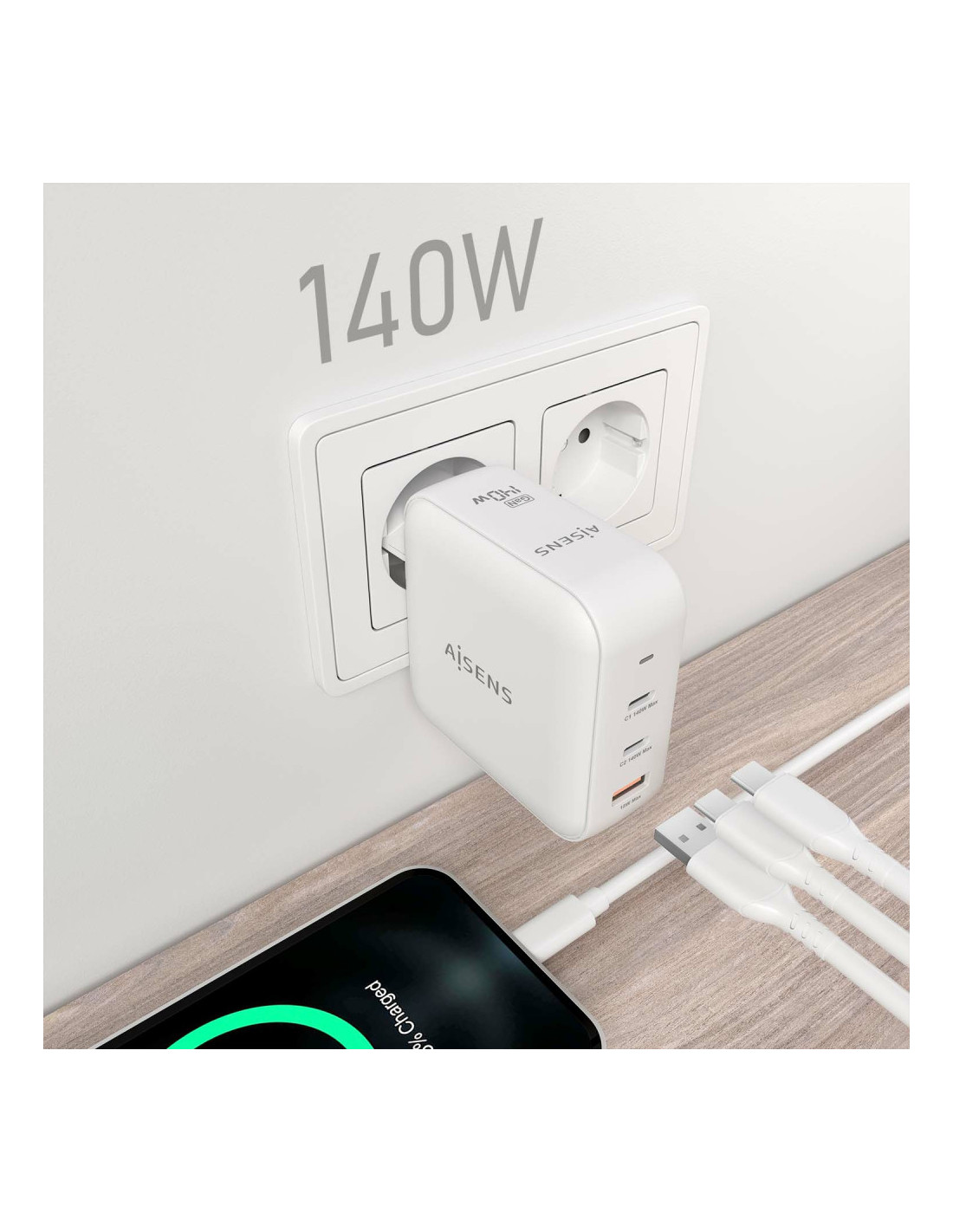 Aisens - Cargador GaN 140W, 2xUSB-C PD3.1 QC4.0, 1xUSB-A QC3.0, Blanco