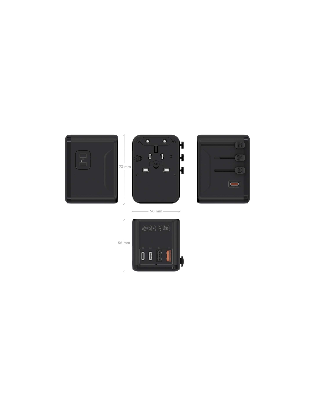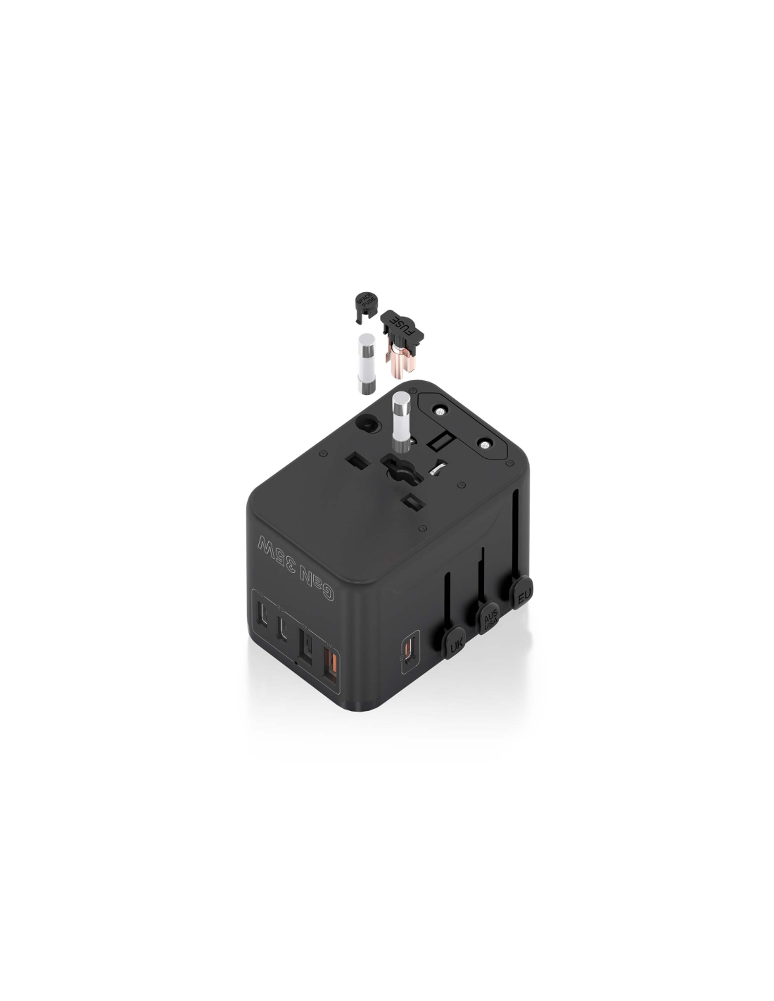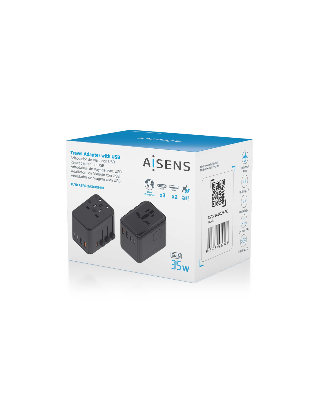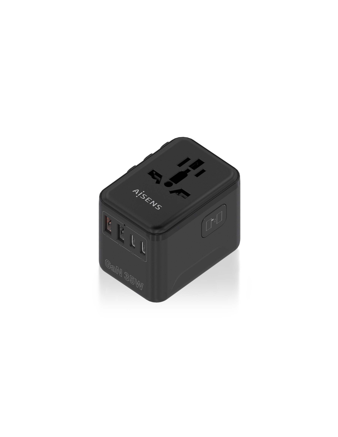 AISENS Adaptador Enchufe Universal Para Viaje EU/USA/UK/AU Con Cargador USB GaN, 2xUSB-A (A1 QC3.0), 3xUSB-C (C1 PD3.0) 35W, Negro. Tipo de cargador: Interior, Alimentación: Corriente alterna, Compatibilidad del cargador: Universal. Voltaje de entrada: 100 - 250 V, Voltaje de salida máximo: 15 V, Corriente de salida de adaptador AC: 3 A. Cantidad de puertos USB 2.0: 2, Número de puertos USB Tipo C: 3, Carga rápida, Funciones de protección de poder: Sobreintensidad, Sobrevoltaje, Sobrecalentamiento, Cortocir
