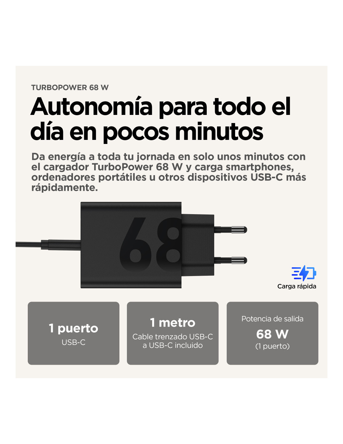 A nadie le gusta estresarse por tener poca batería, especialmente antes de tener un buen plan por la noche o un día ajetreado en el trabajo. Para eso está la familia de cargadores TurboPower™, para que dispongas de horas de autonomía en solo unos pocos minutos de carga.(7) Recarga tu smartphone, tablet, ordenador portáil, smartwatch, auriculares y más dispositivos con uno de nuestros cargadores [disponibles en versiones de 125 W.(1) Los cargadores TurboPower™ son los únicos que necesitas, ya que son compatibles con un gran número de dispositivos en todo el mundo. Y además, están diseñados para que quepan fácilmente en el bolsillo o en el bolso. Incorporan la tecnología TurboPower™ Shield, con la que podrás estar totalmente tranquilo sabiendo que tus dispositivos están protegidos contra sobrecalentamientos, picos de tensión y otras potenciales perturbaciones, incluso si los cargas a máxima velocidad.