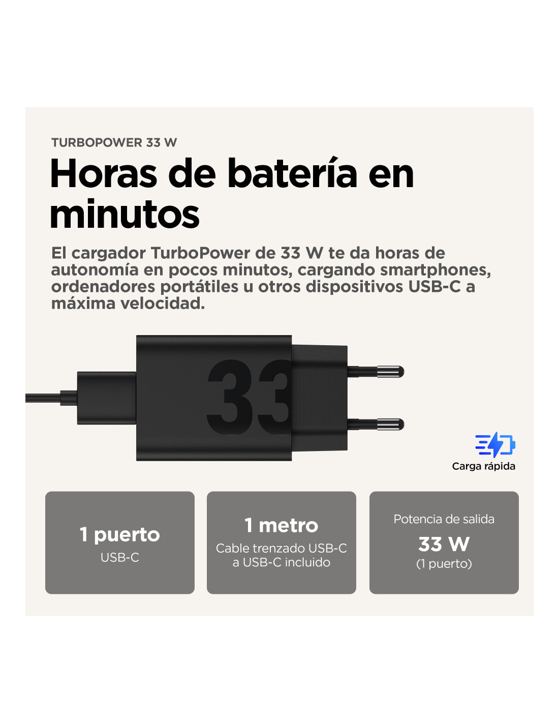 A nadie le gusta estresarse por tener poca batería, especialmente antes de tener un buen plan por la noche o un día ajetreado en el trabajo. Para eso está la familia de cargadores TurboPower™, para que dispongas de horas de autonomía en solo unos pocos minutos de carga.(7) Recarga tu smartphone, tablet, ordenador portáil, smartwatch, auriculares y más dispositivos con uno de nuestros cargadores [disponibles en versiones de 33 W.(1) Los cargadores TurboPower™ son los únicos que necesitas, ya que son compatibles con un gran número de dispositivos en todo el mundo. Y además, están diseñados para que quepan fácilmente en el bolsillo o en el bolso. Incorporan la tecnología TurboPower™ Shield, con la que podrás estar totalmente tranquilo sabiendo que tus dispositivos están protegidos contra sobrecalentamientos, picos de tensión y otras potenciales perturbaciones, incluso si los cargas a máxima velocidad.