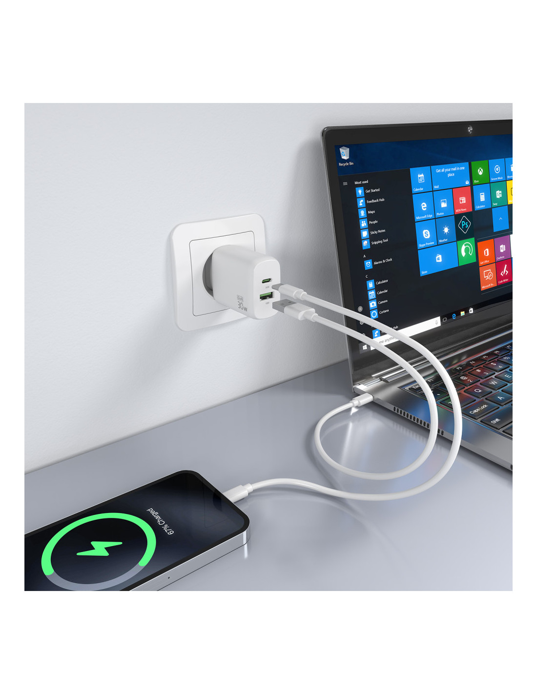 - Este cargador puede cargar simultáneamente 2 dispositivos USB-A y USB-C a máxima velocidad.