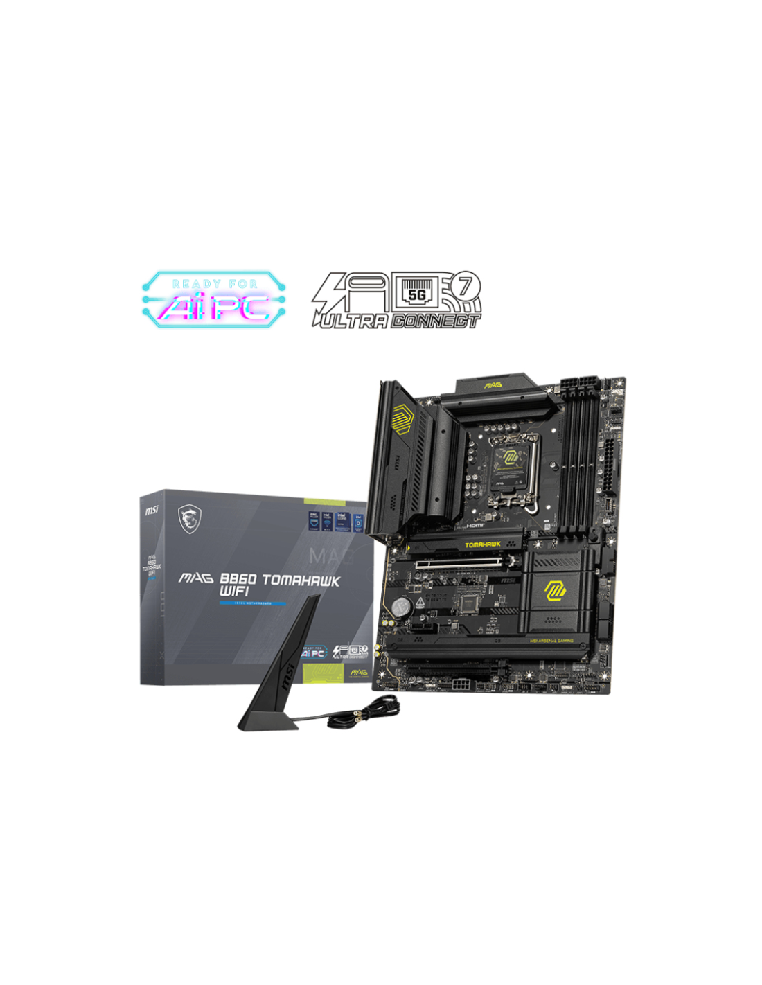 MSI MAG B860 TOMAHAWK WIFI. Fabricante de procesador: Intel, Socket de procesador: LGA 1851 (Socket V1), Procesador compatible: Intel Core Ultra (Series 2). tipos de memoria compatibles: DDR5-SDRAM, Memoria interna máxima: 256 GB, Tipo de ranuras de memoria: DIMM. Interfaces de disco de almacenamiento soportados: M.2, Micro SATA III, Tipos de unidades de almacenamiento admitidas: HDD & SSD, Niveles RAID: 0, 1, 5, 10. Tipo de interfaz ethernet: 5 Gigabit Ethernet, Estándar Wi-Fi: Wi-Fi 7 (802.11be), Wi-Fi es